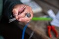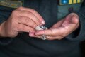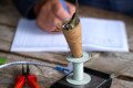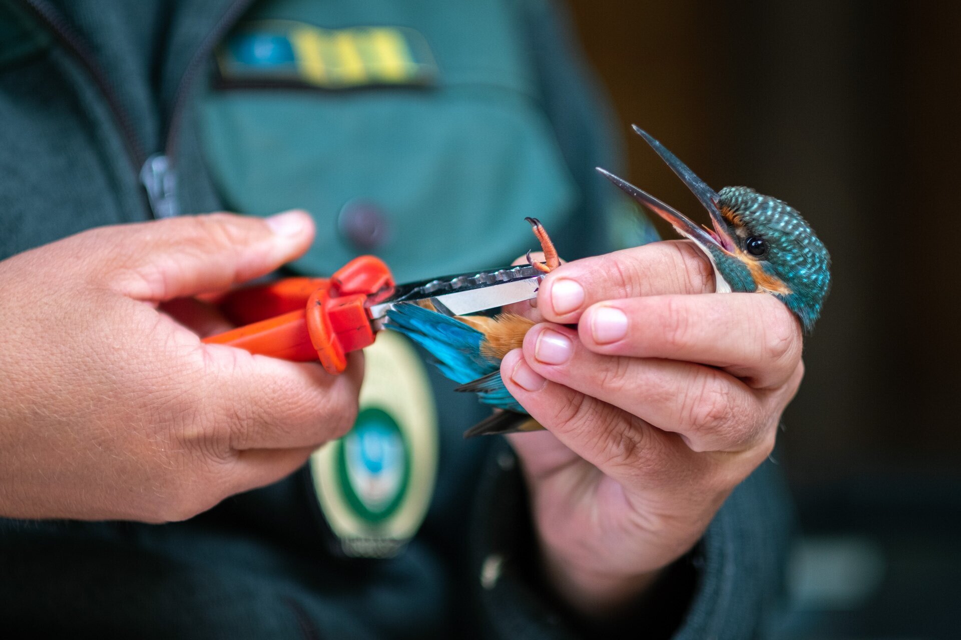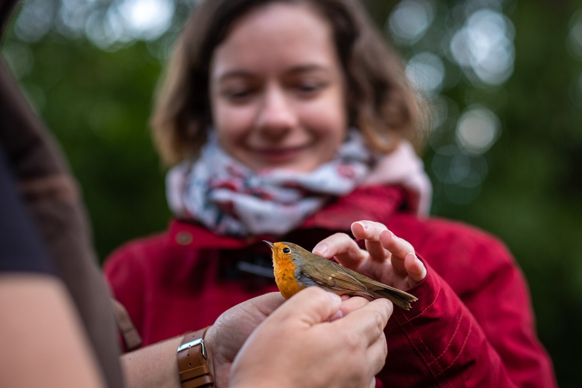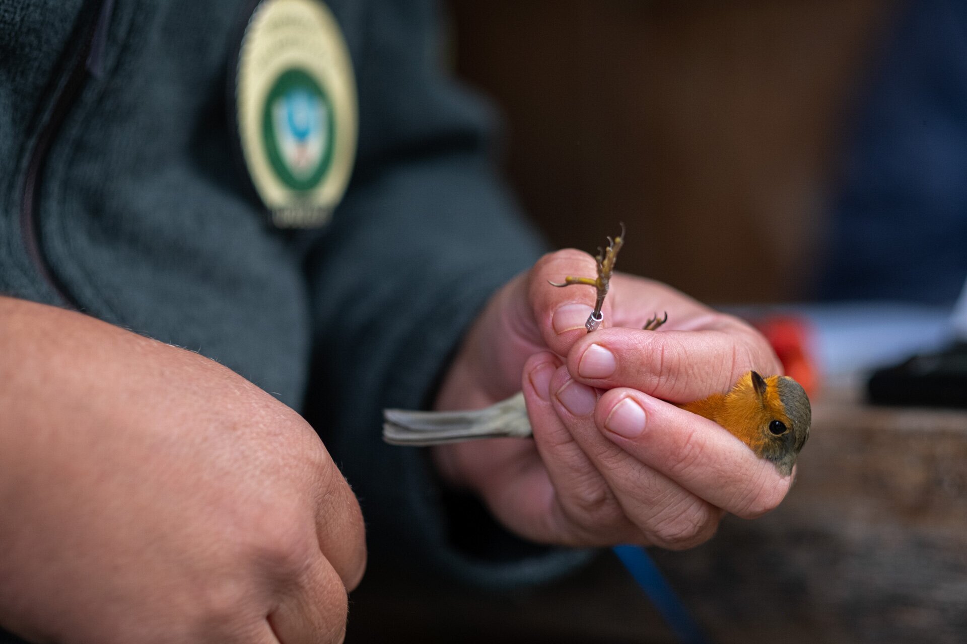 Gyűrűzéskor minden befogott madár egyedi sorszámmal ellátott alumínium jelölőgyűrűt kap. A képen épp egy vörösbegy lábára került ornitológiai gyűrű