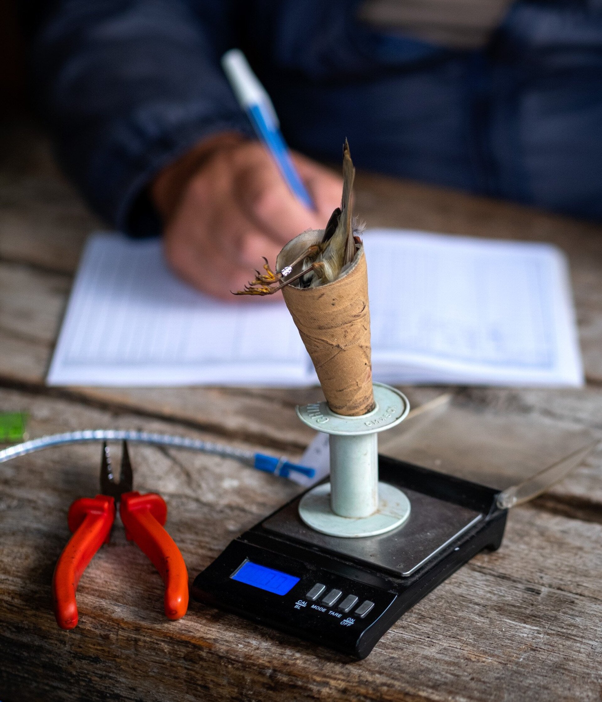 A biometriai mérés része a madár testtömegének meghatározása, egy tölcsérbe fejjel lefelé beleállítják, és megmérik a mérlegen, majd az értéket feljegyzik a terepnaplóba