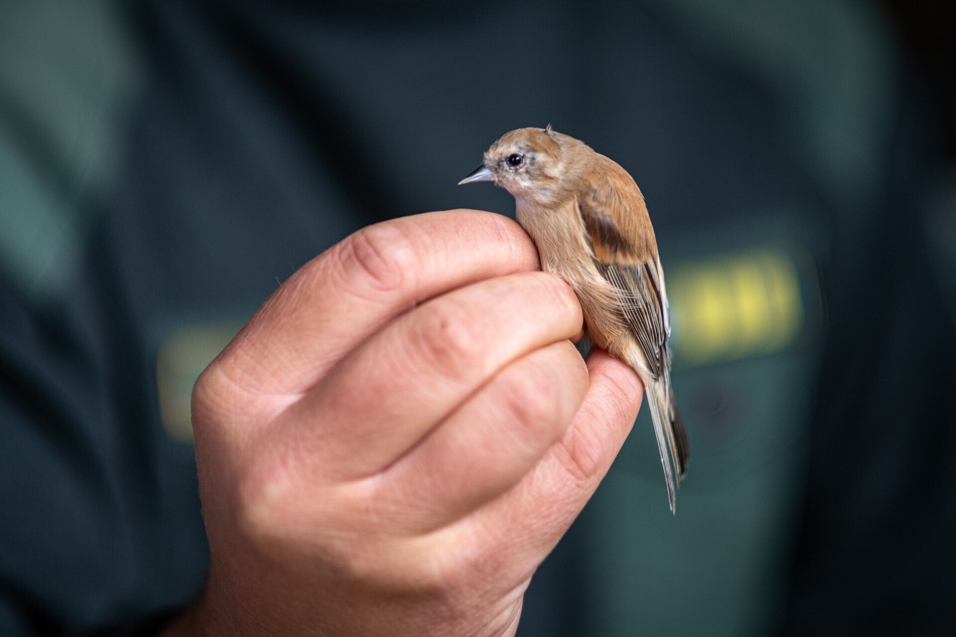 Ha minden igaz, ez egy nádi tücsökmadár. Képről nagyon nehéz megkülönböztetni ezeket a nádi énekesmadarakat, a sok poszáta, nádirigó és tücsökmadár igazi fejtörő tud lenni. Gyűrűzésnél természetesen minden apró kis részletet meg tudnak nézni, így pontosan meg tudják határozni a hálóba akadt madárka faját