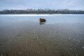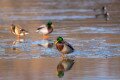 Tőkés réce kimerülten egy befagyott tó felszínén