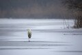Nagy kócsag a jégen, egyik lábát tollruhája alatt melengeti