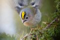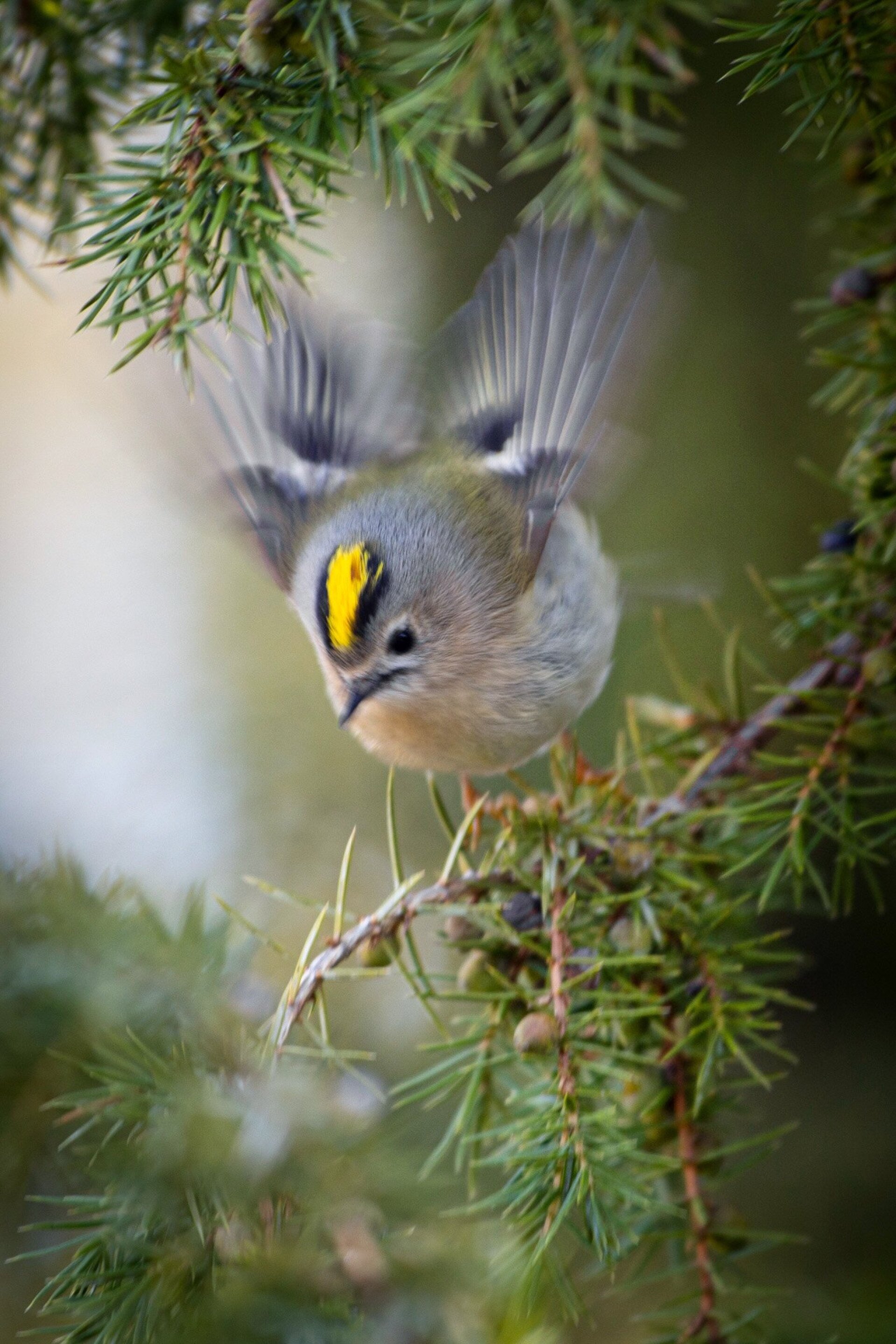 Sárgafejű királyka reppen fel a bugaci puszta egyik borókabokráról