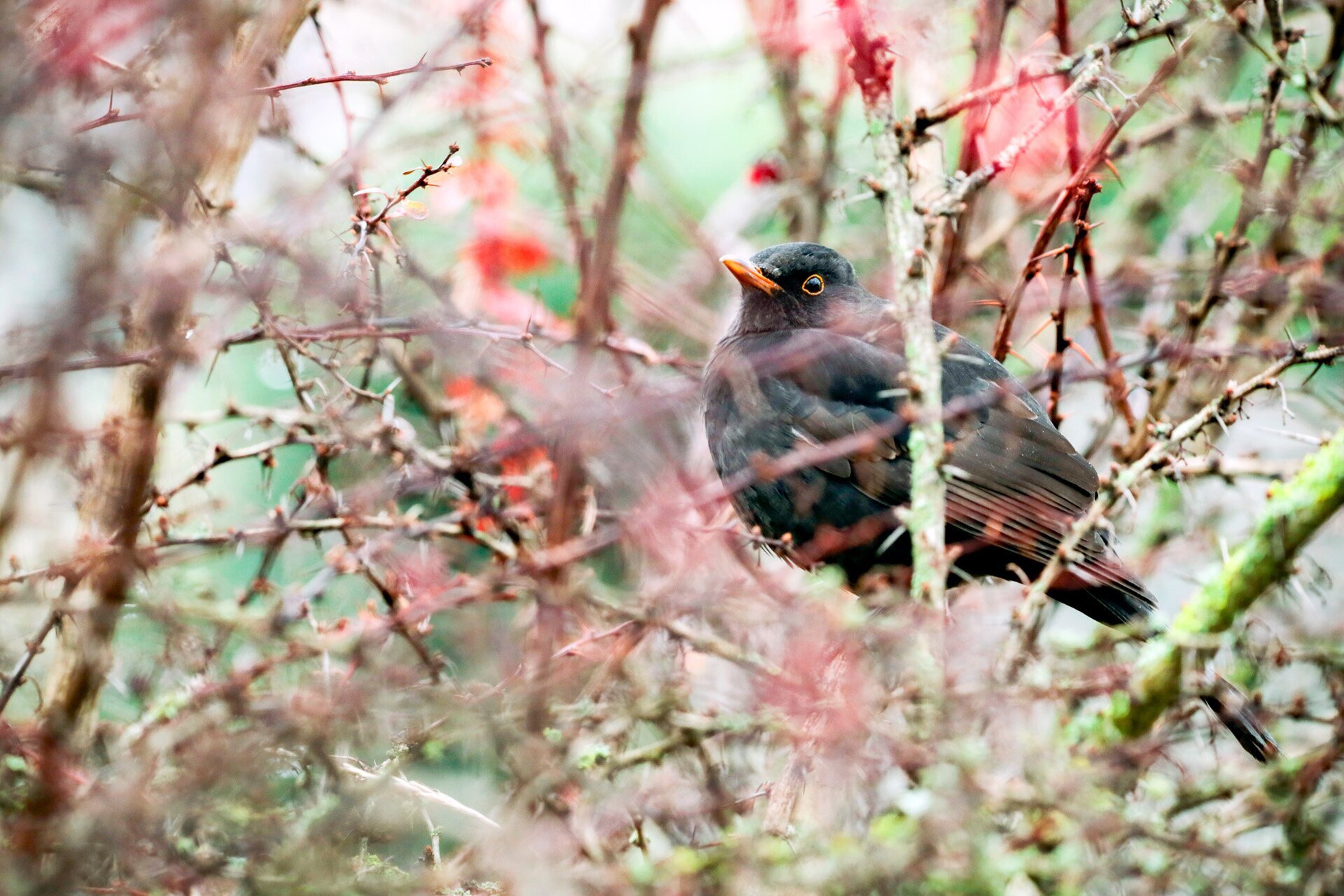 Fekete rigó figyel egy bokorból egy téli napon a Csepel-szigeten
