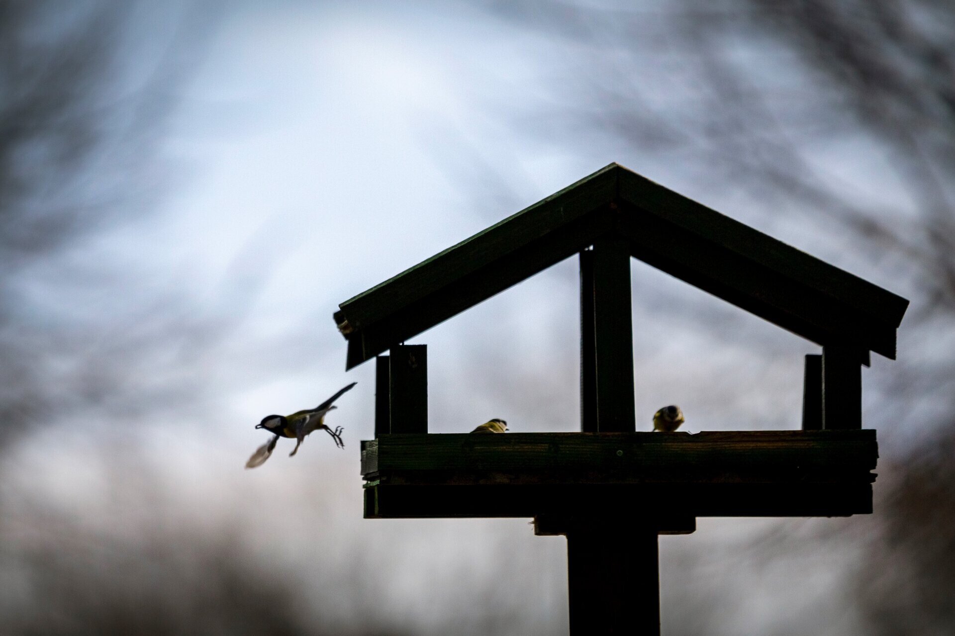 Széncinege reppen el az etetőről a Tiszaigari Arborétumban
