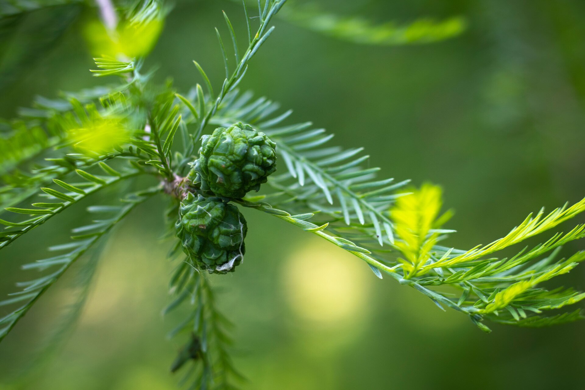 A mocsárciprus gömbölyded toboza, ezek még elég frissek, később vörösbarnák lesznek