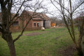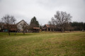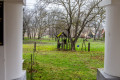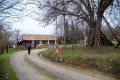 Gyümölcsfák és fenyők, az Őrség jellemző fái, háttérben egy lábaspajtát látni