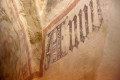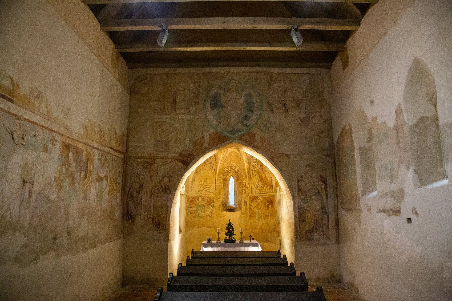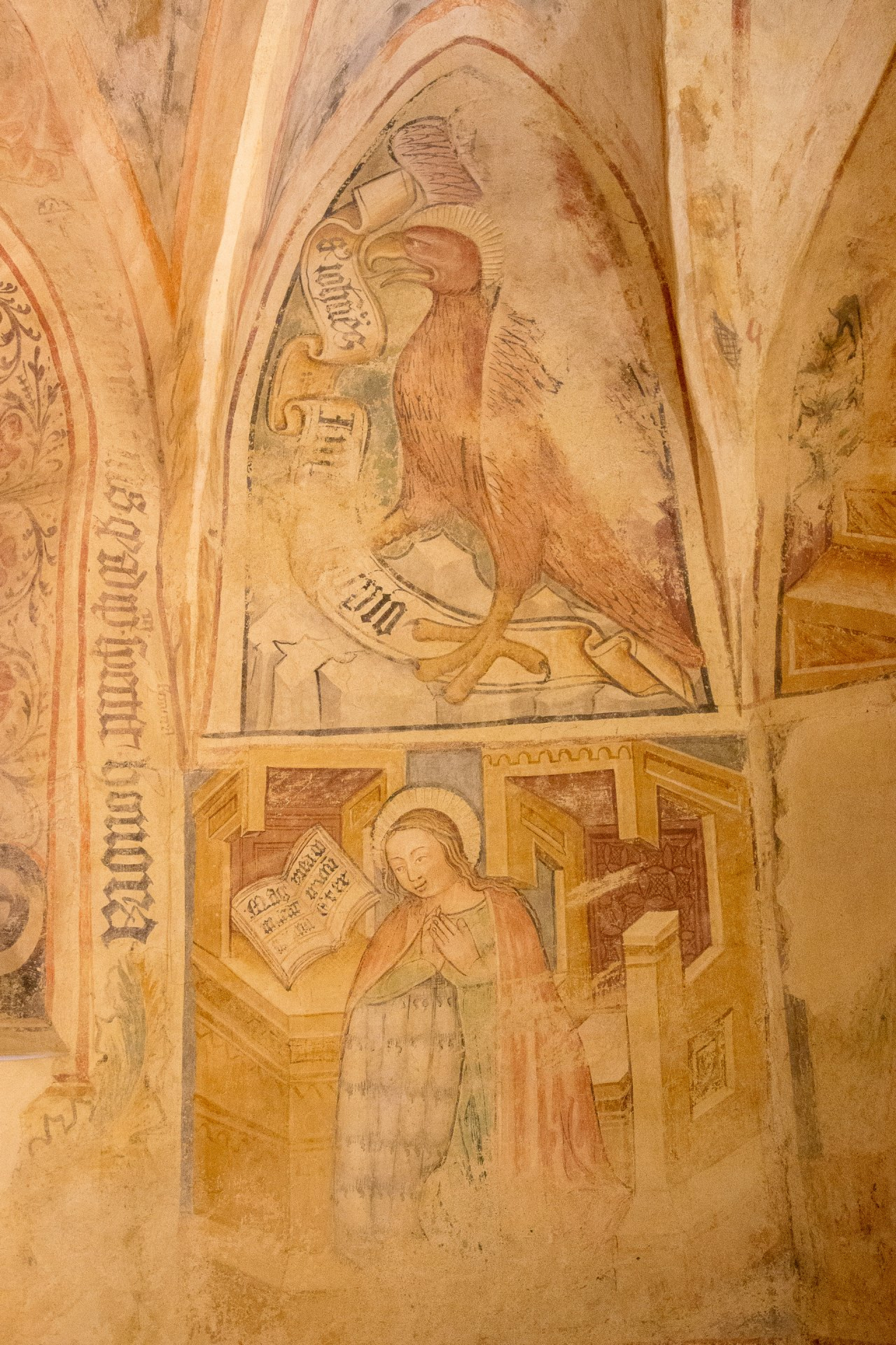 A freskókon, amelyeket 1377 körül festett Aquila János, a Bibliából és a szentek életéből vett jelenetek vannak