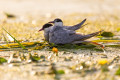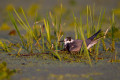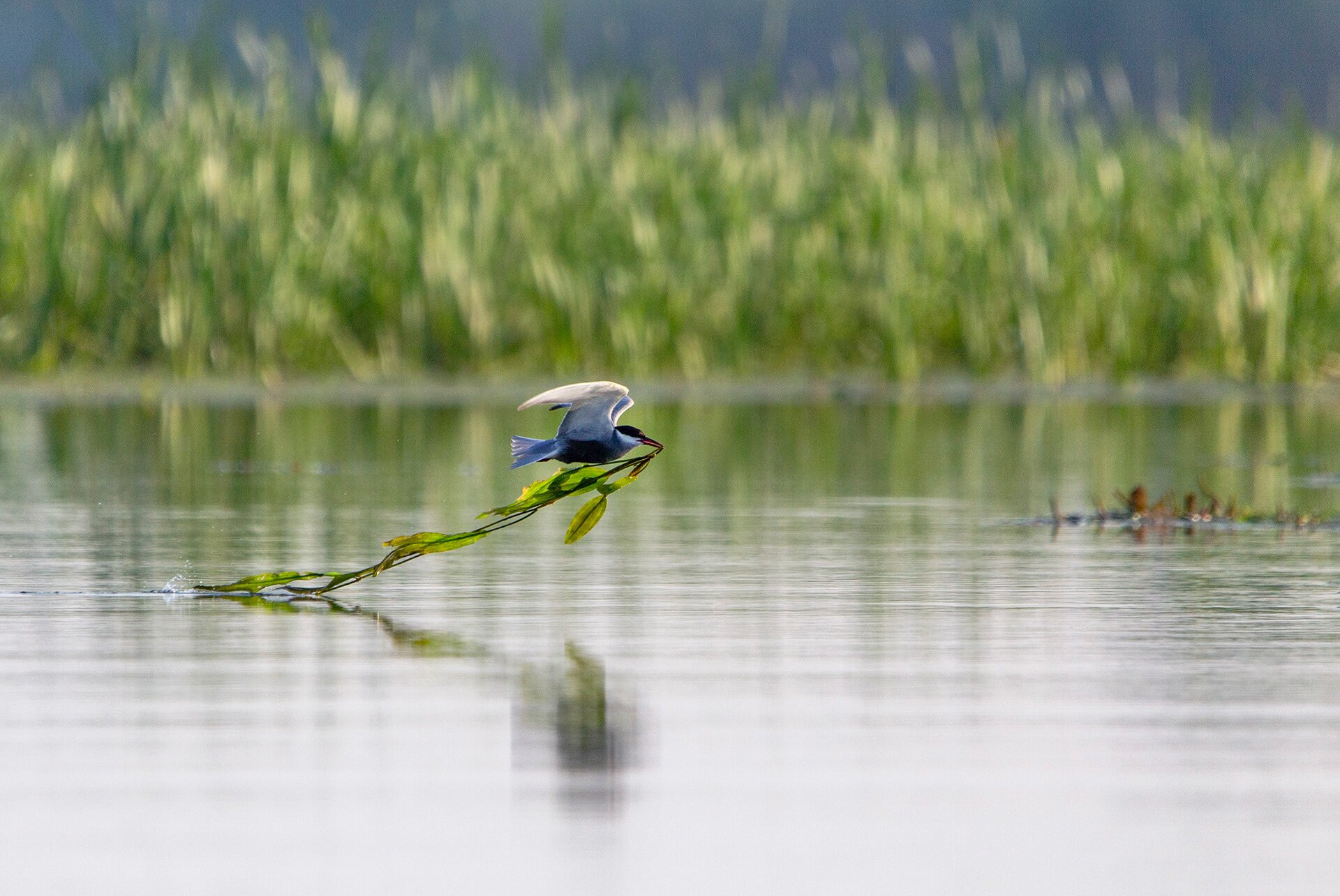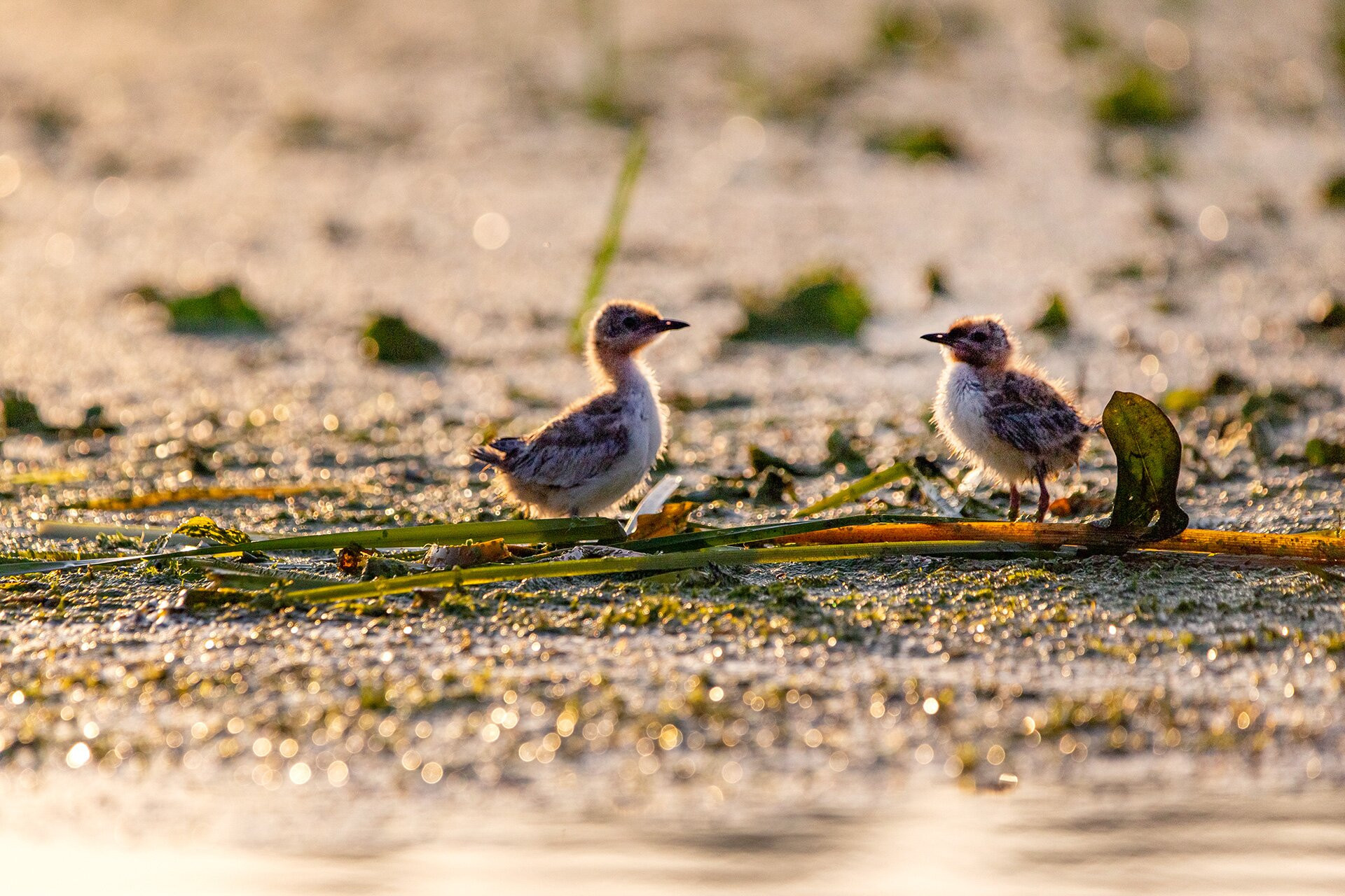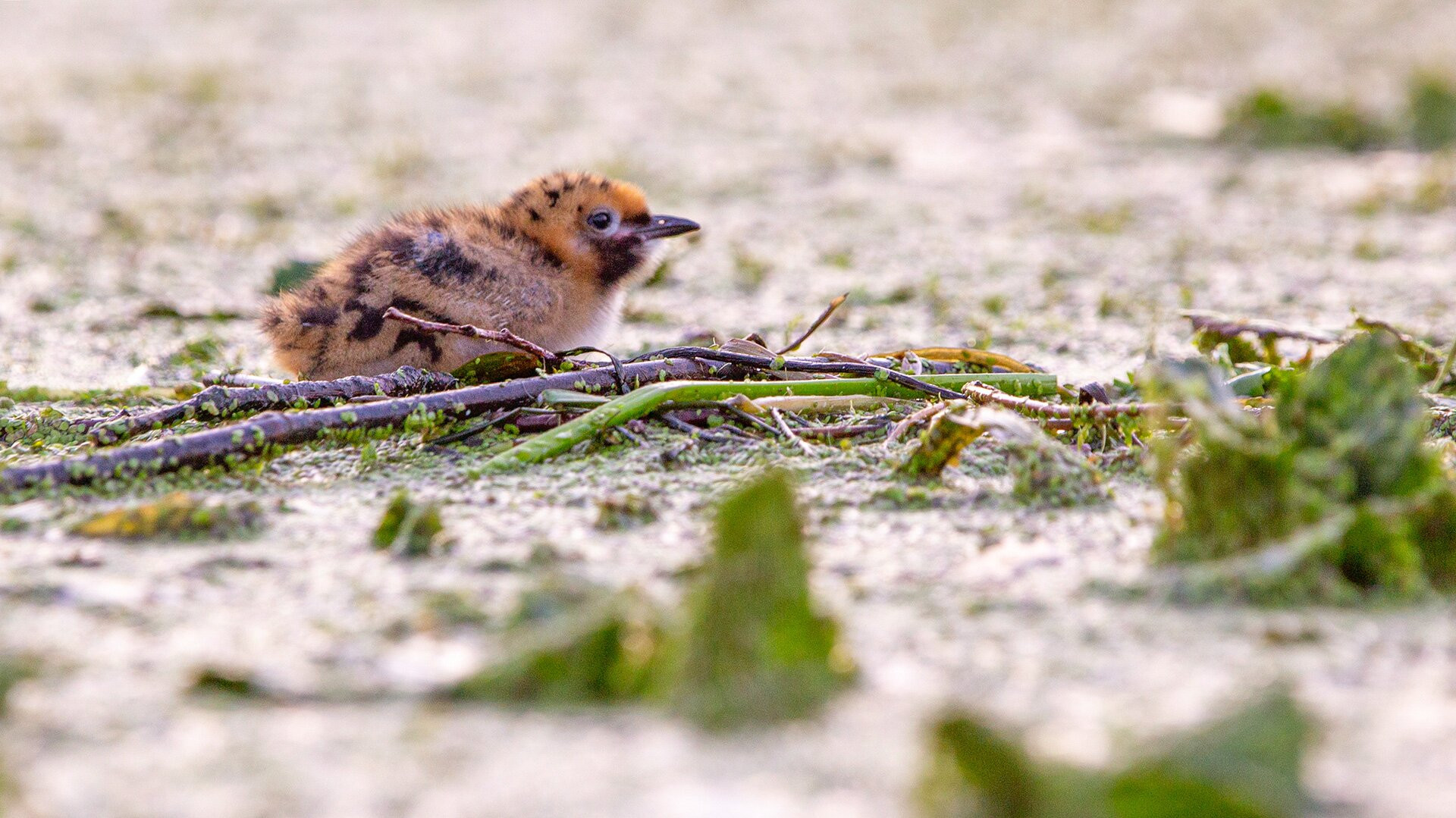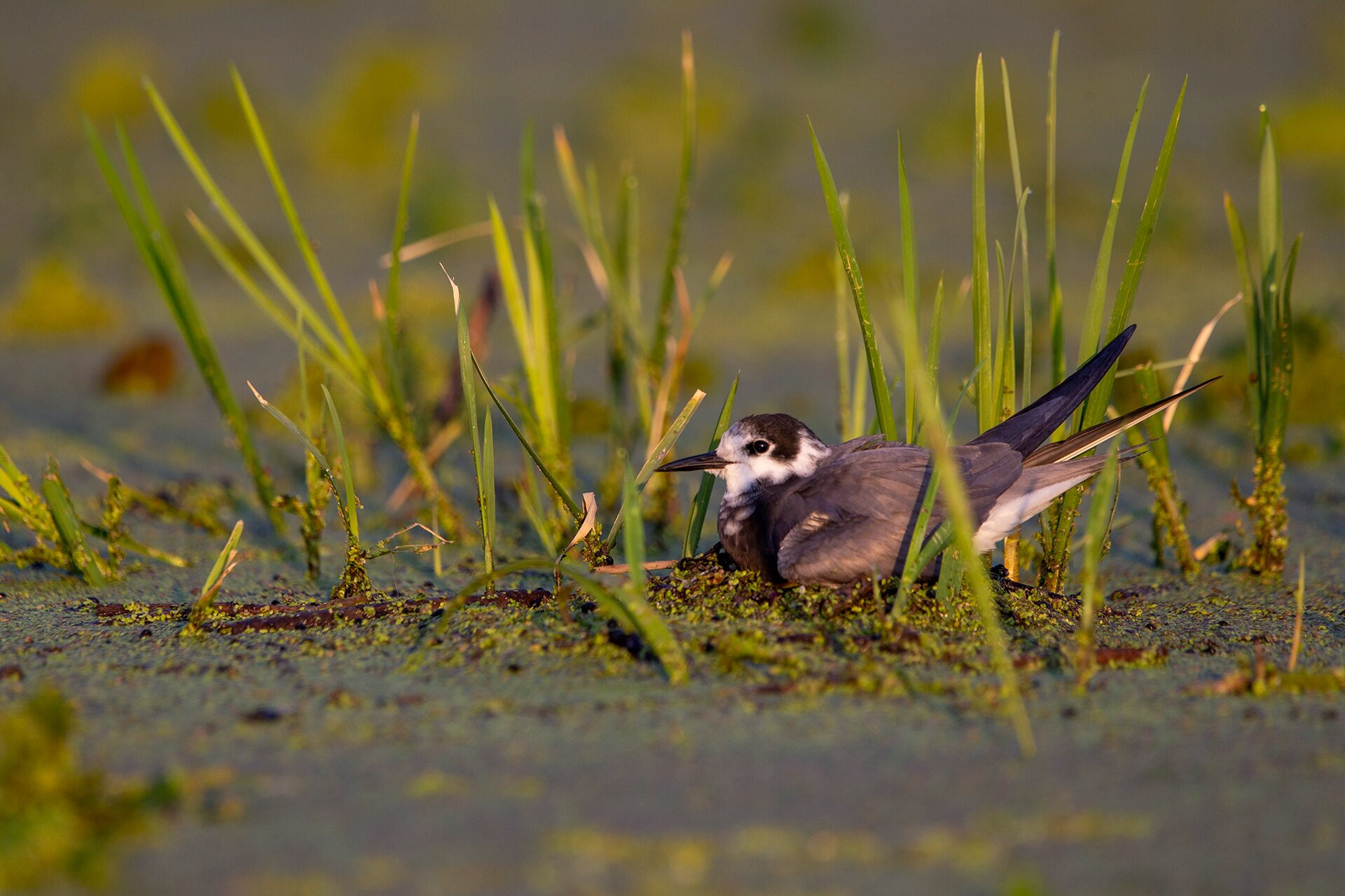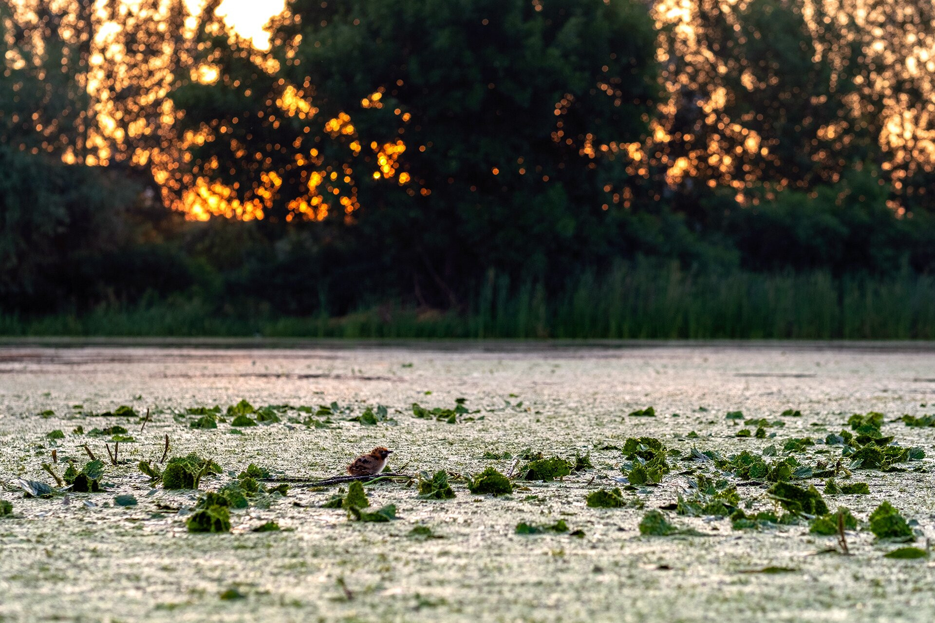 A még szunnyadó tájat hamarosan szorgos szerkőszülők nyüzsgése tölti meg, ezt a megszeppent szerkőfiókát pedig alig vesszük észre a hajnali hínárbölcsőben