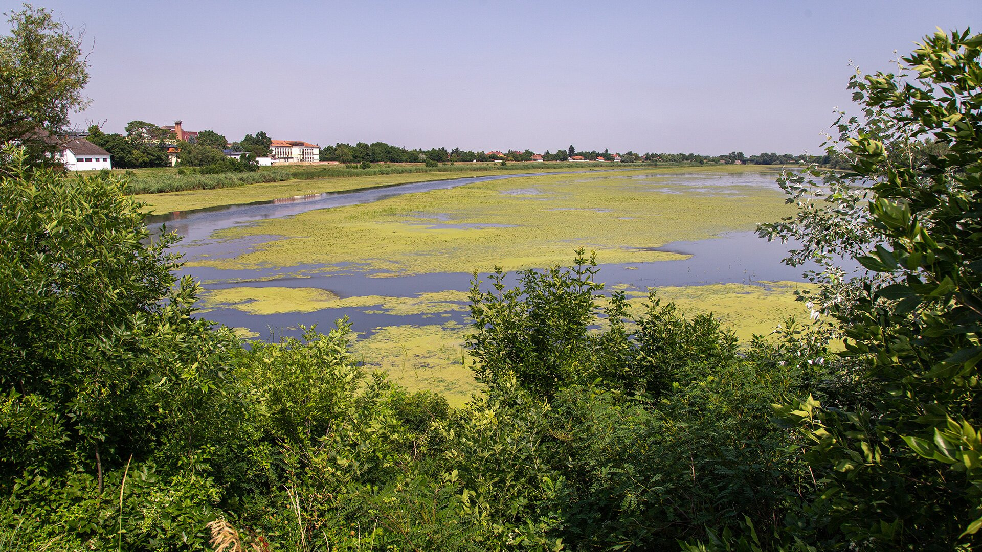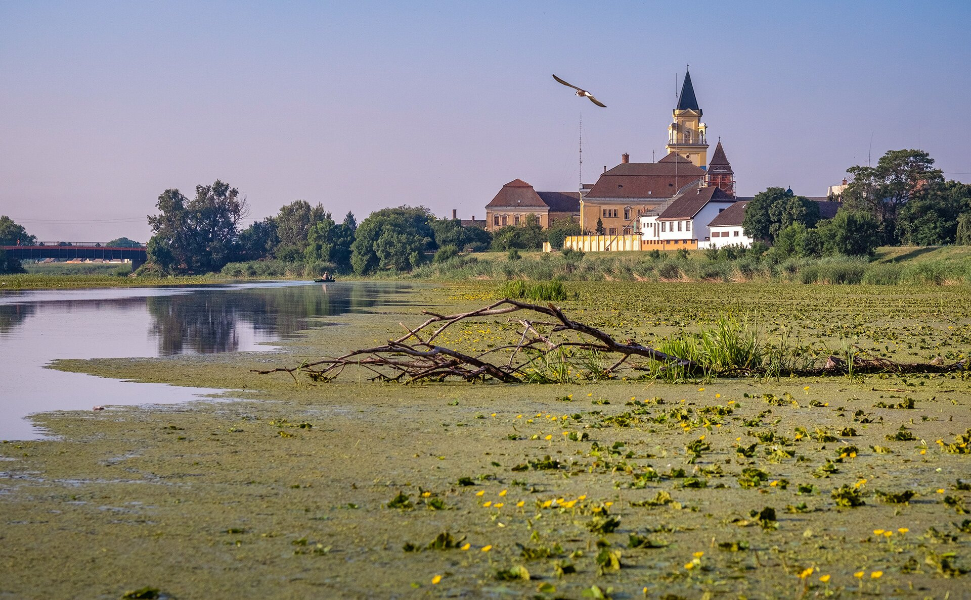Értékes hínártársulás vette birtokba a Hortobágy-Berettyót, háttérben a mezőtúri Polgármesteri Hivatal