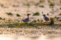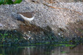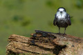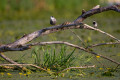 A fiatal kormos szerkő mellett (balra) egy barázdabillegető (jobbra) nézelődik a vízből kiálló uszadékfán