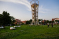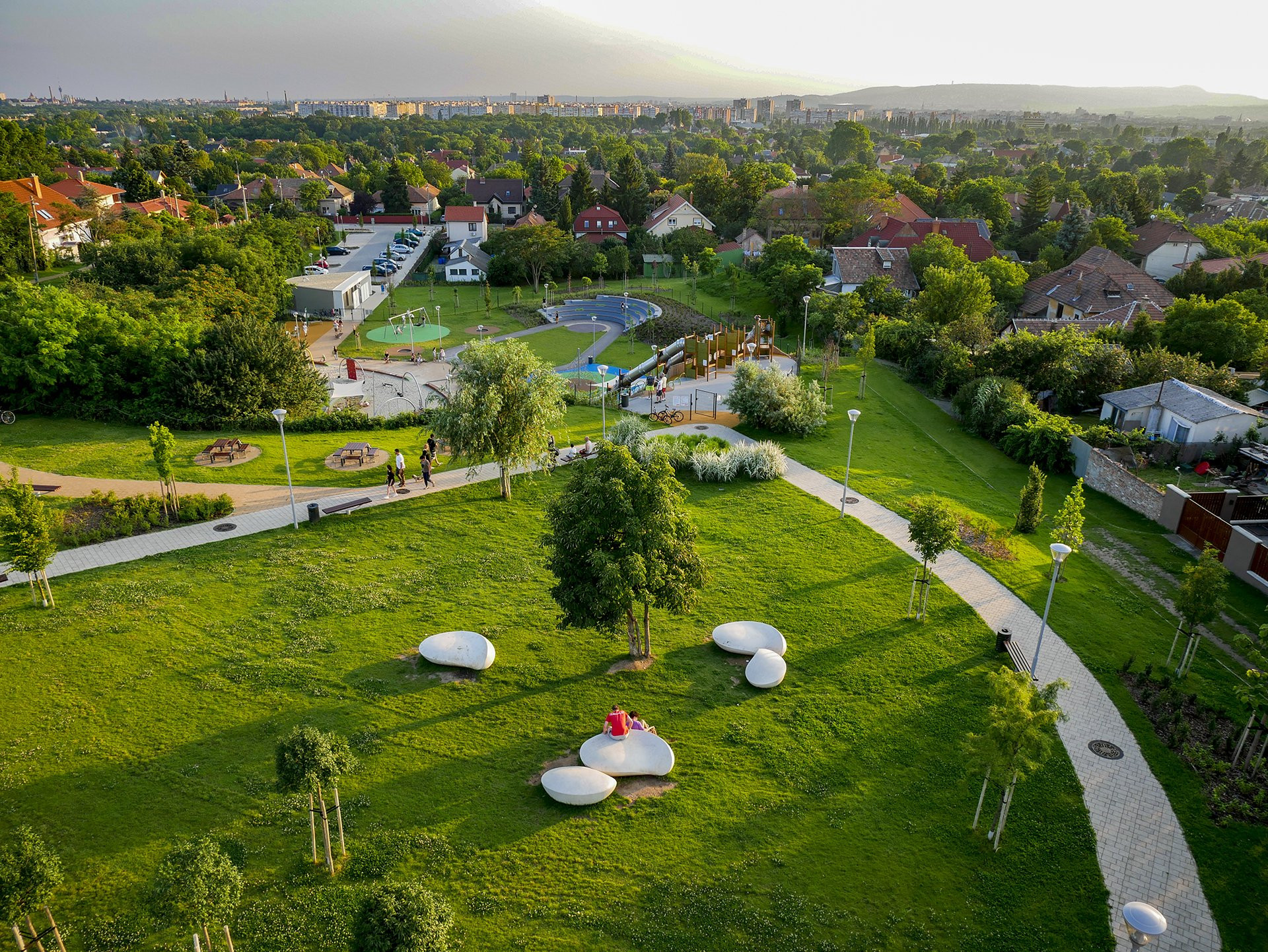 A kilátó alatt elterülő park, azaz a Reformátorok tere, kicsit távolabb a játszótér csúszdákkal és lelátóval