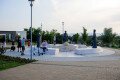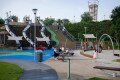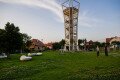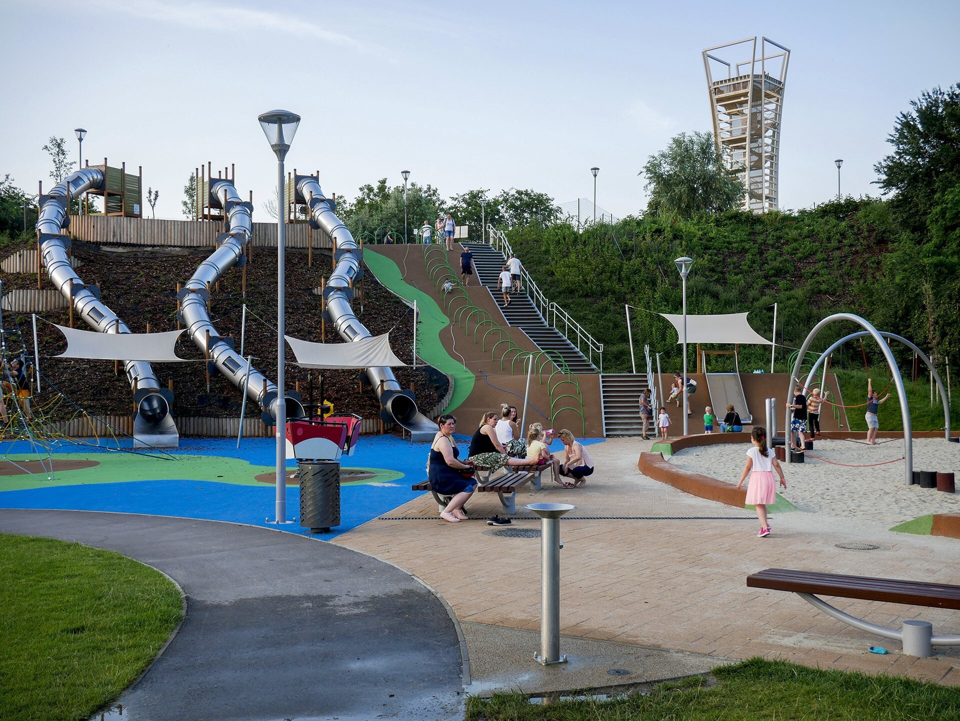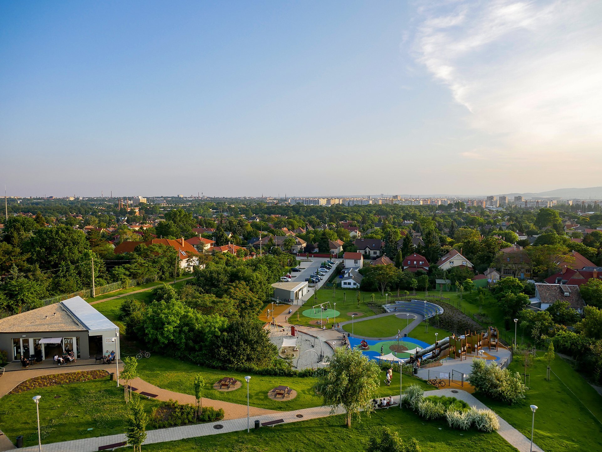 A kilátó alatt elterülő park, azaz a Reformátorok tere, kicsit távolabb a játszótér csúszdákkal és lelátóval