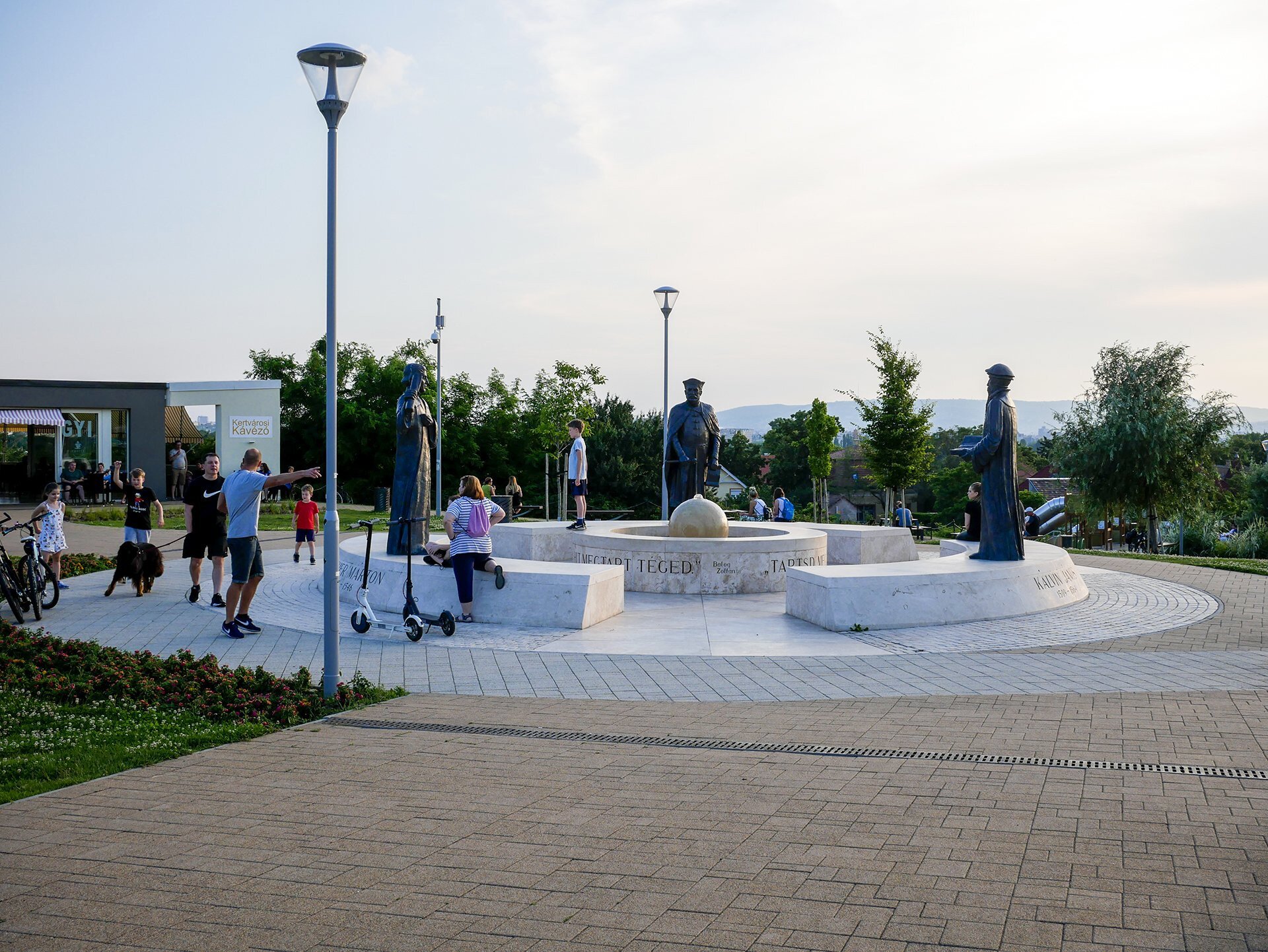 Kálvin János, Luther Márton és Bocskai István egész alakos bronzszobra körül általában gyerekek rohangásznak