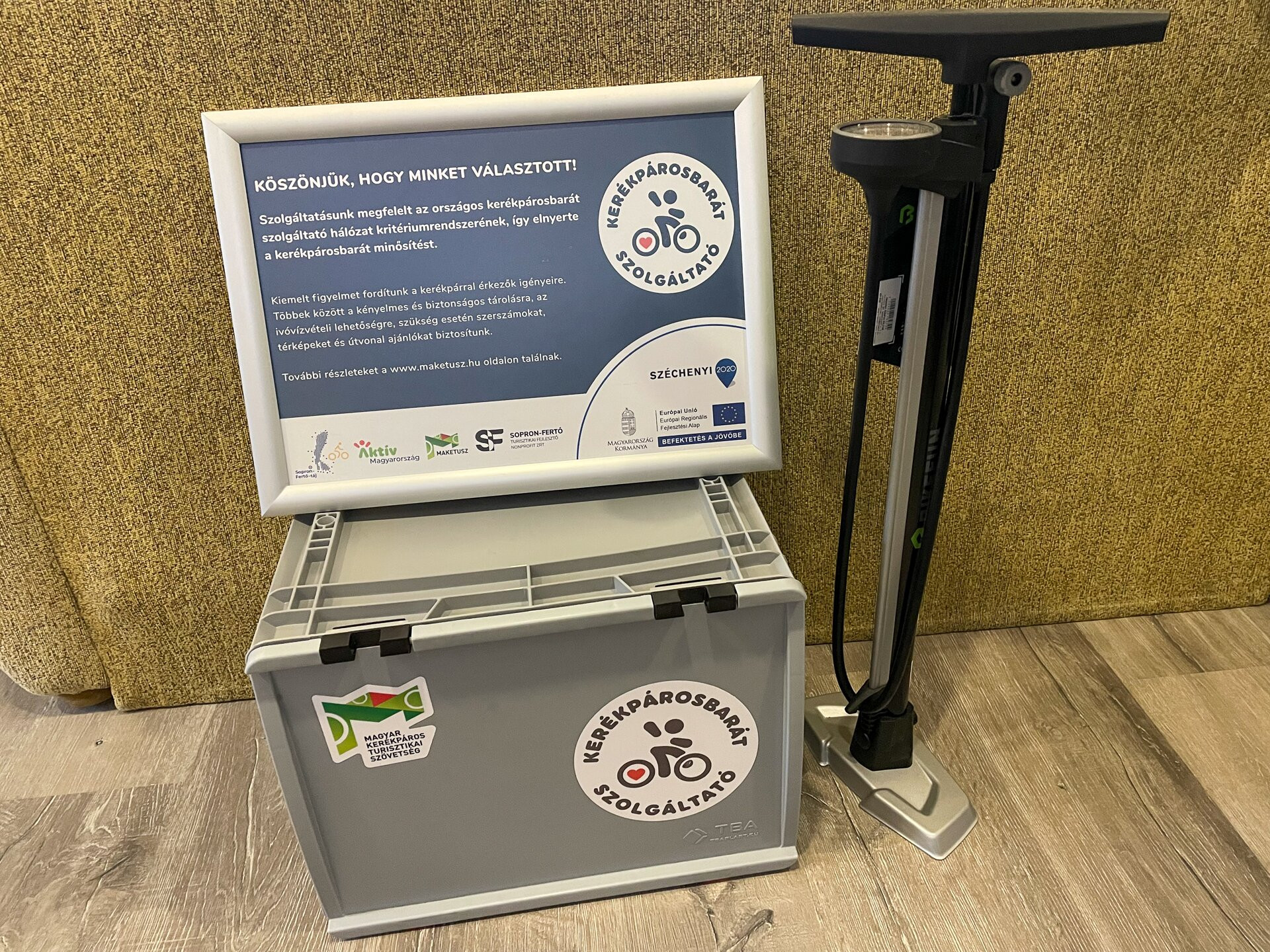 Íme egy kerékpárosbarát hely alapkellékei: profi szerszámosláda (benne minden szükséges kellékkel), pumpa és egy kis tábla, hogy mindezekről a külvilág is tudjon