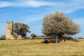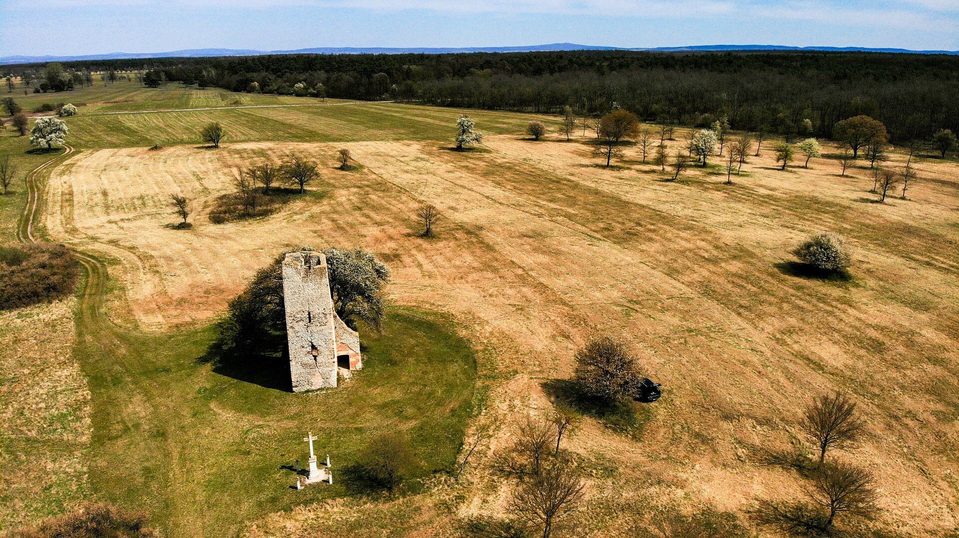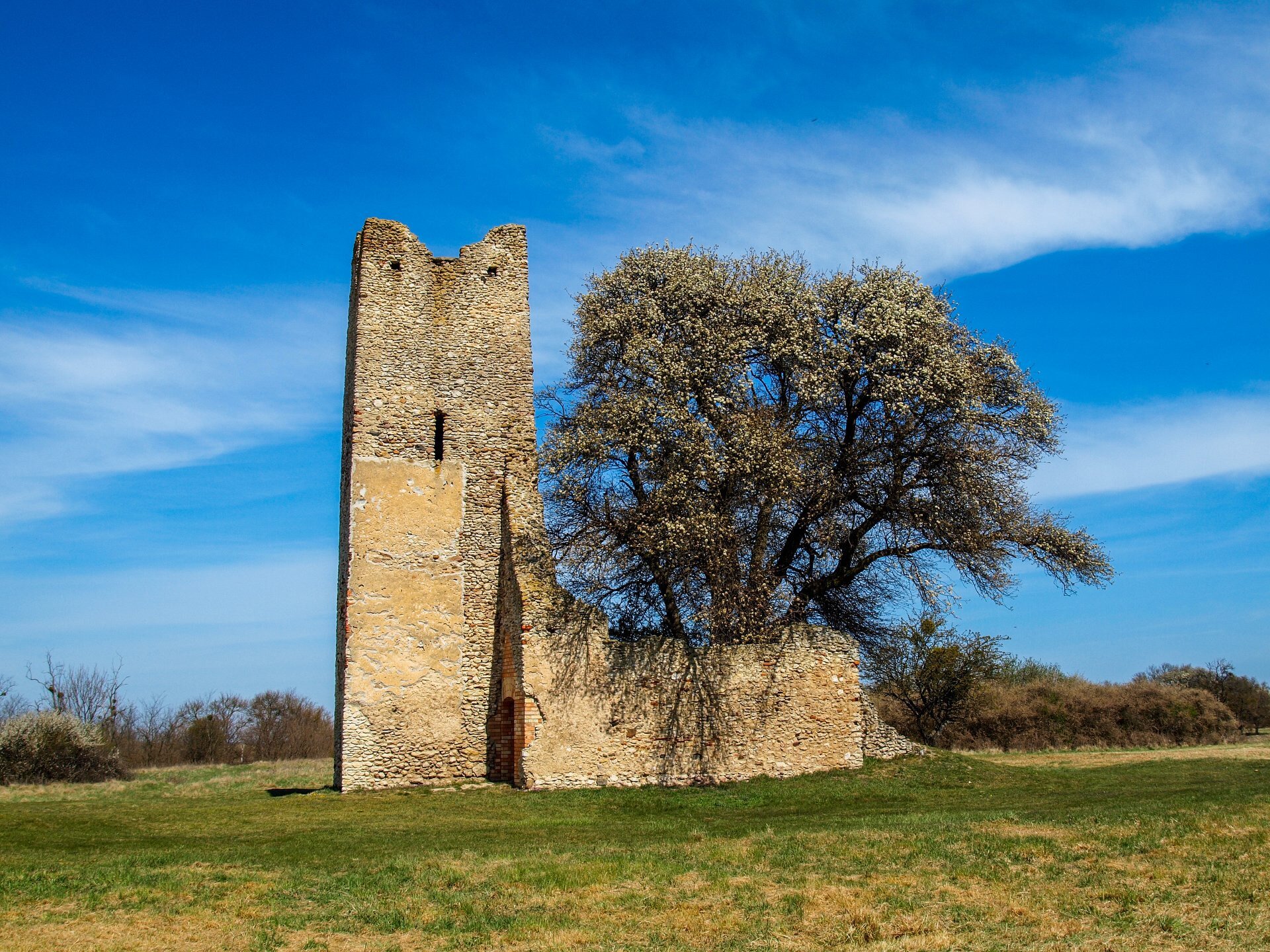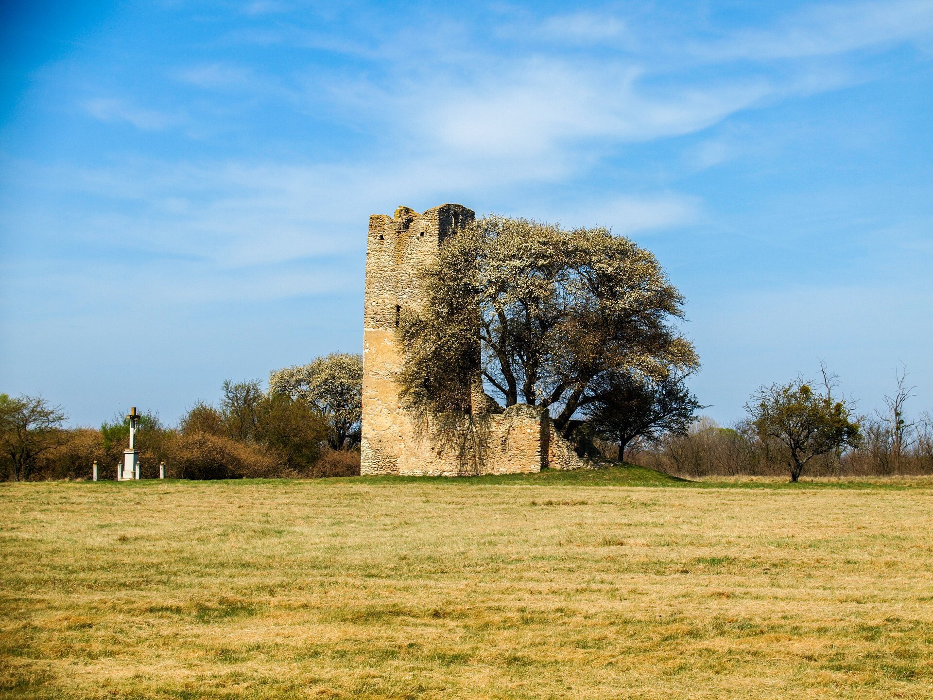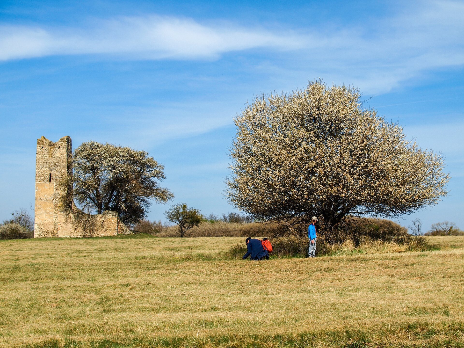 A torony körül virágzó vadkörte- és vadalmafák, vadrózsabokrok tarkítják a tájat