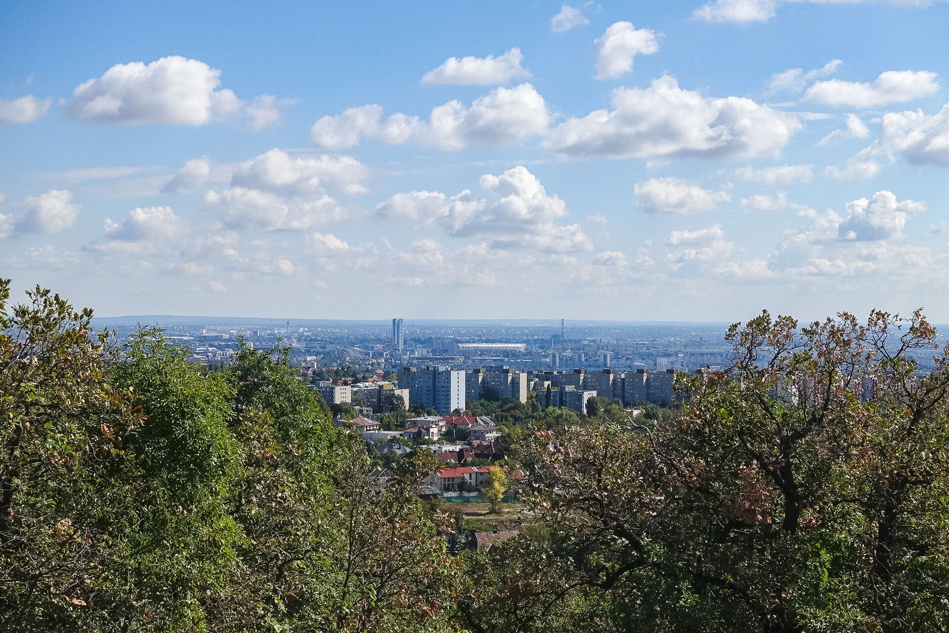 Kilátás fentről. Előtérben a gazdagréti lakótelep, a mindenhonnan látszó MOL-torony és Dél-Pest, ameddig a szem ellát