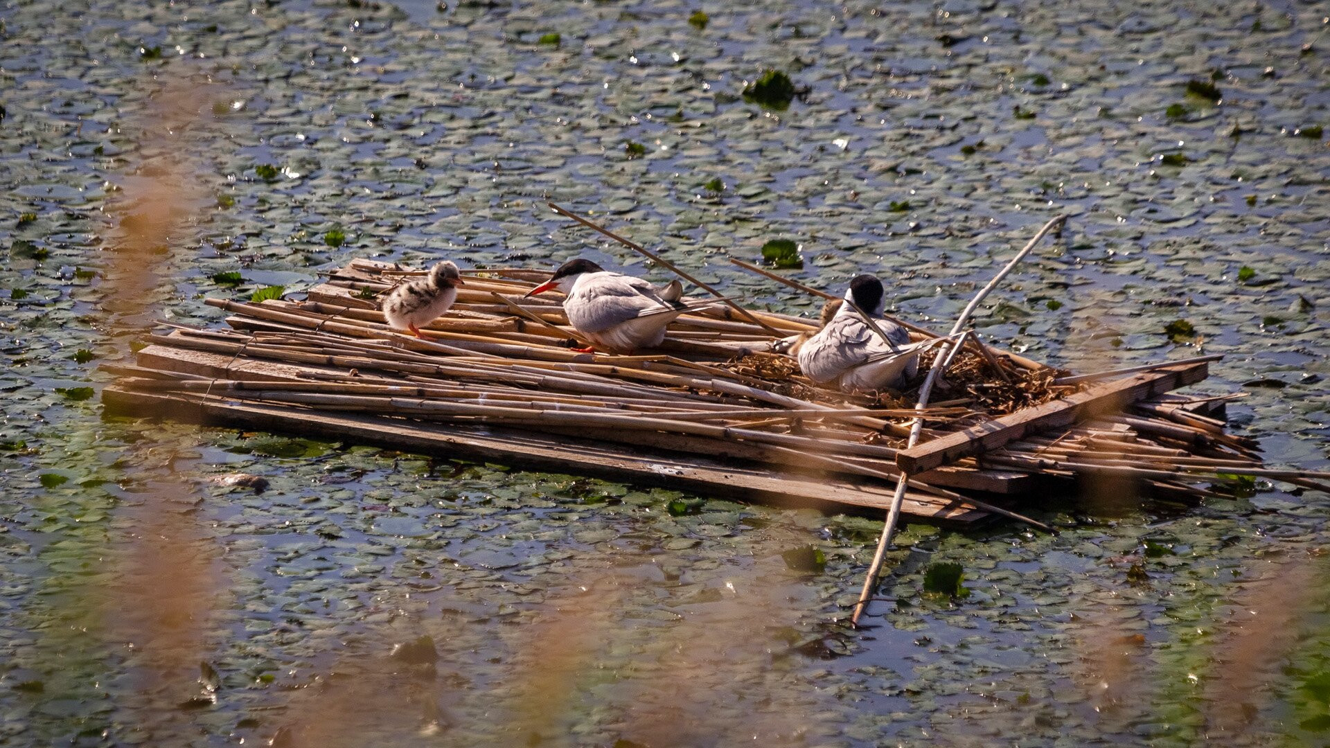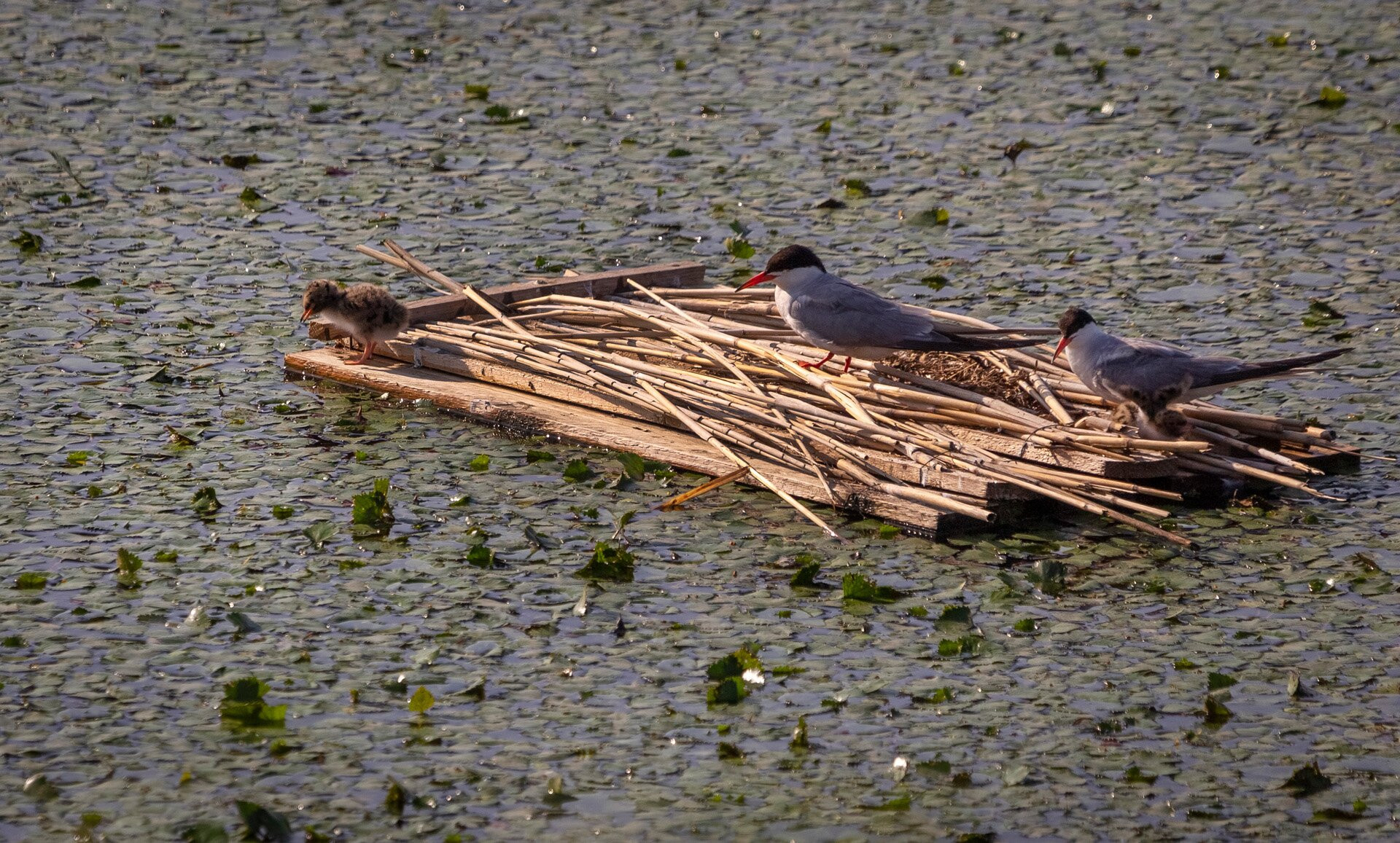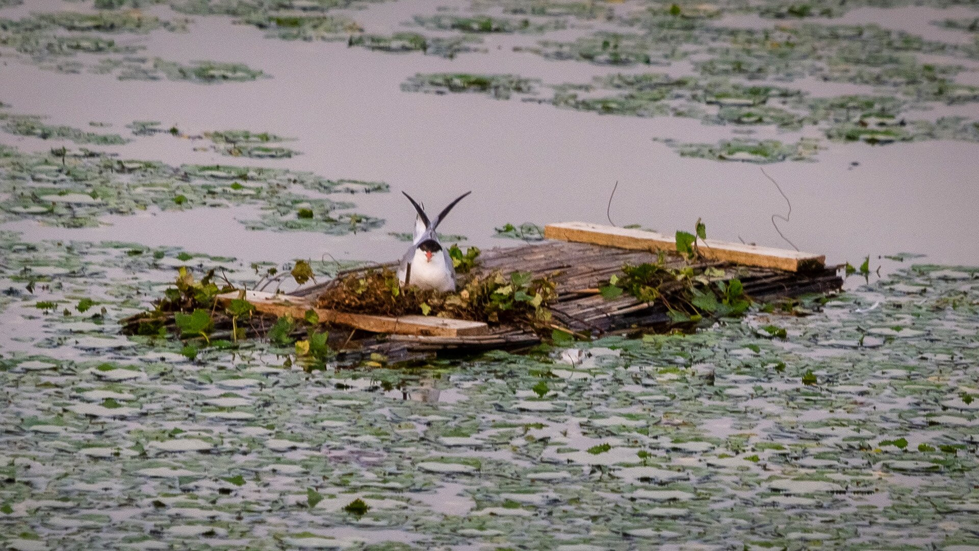 Raklapból készült mesterséges sziget, amelyen több csérpár is költeni kezdett