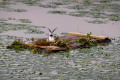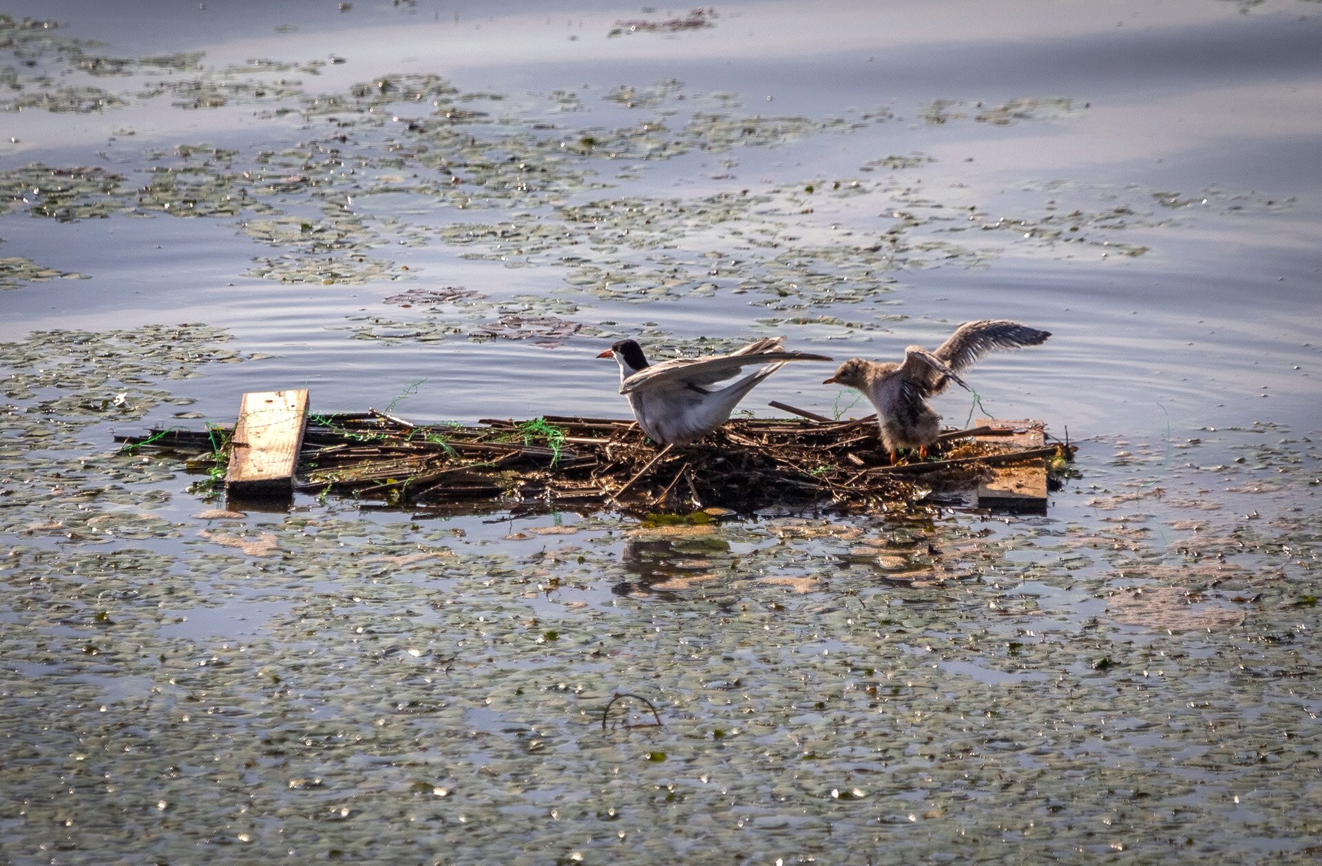 Ez a nagyobb fióka már próbálgatja a szárnyait, nagyon szeretne már úgy repülni, mint a szülei, de erre még várnia kell. Egyébként ezt a fészket már eléggé megtépázták a körülmények, mivel a hínárnövényzet szélén van, a hullámzásnak sokkal jobban ki van téve