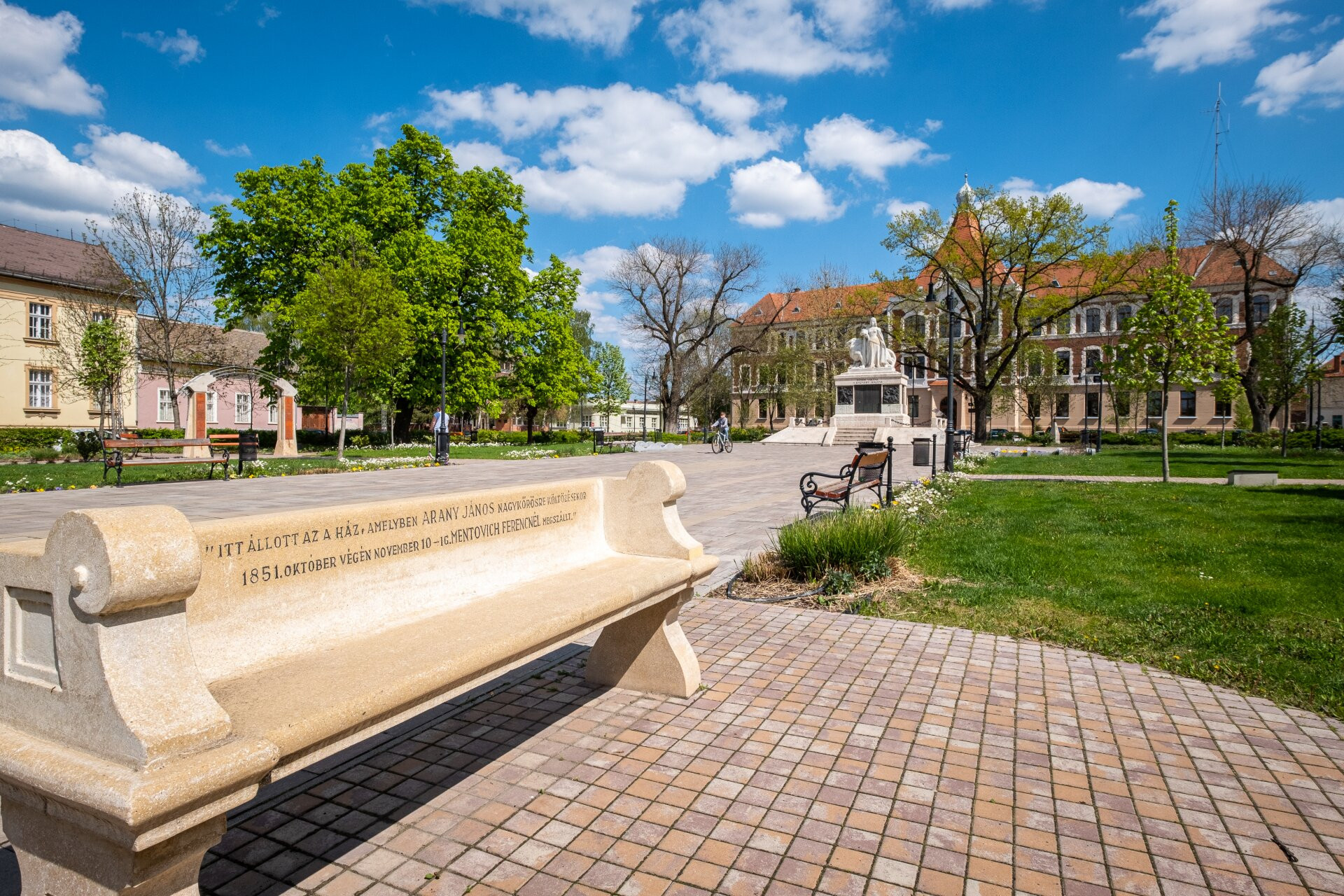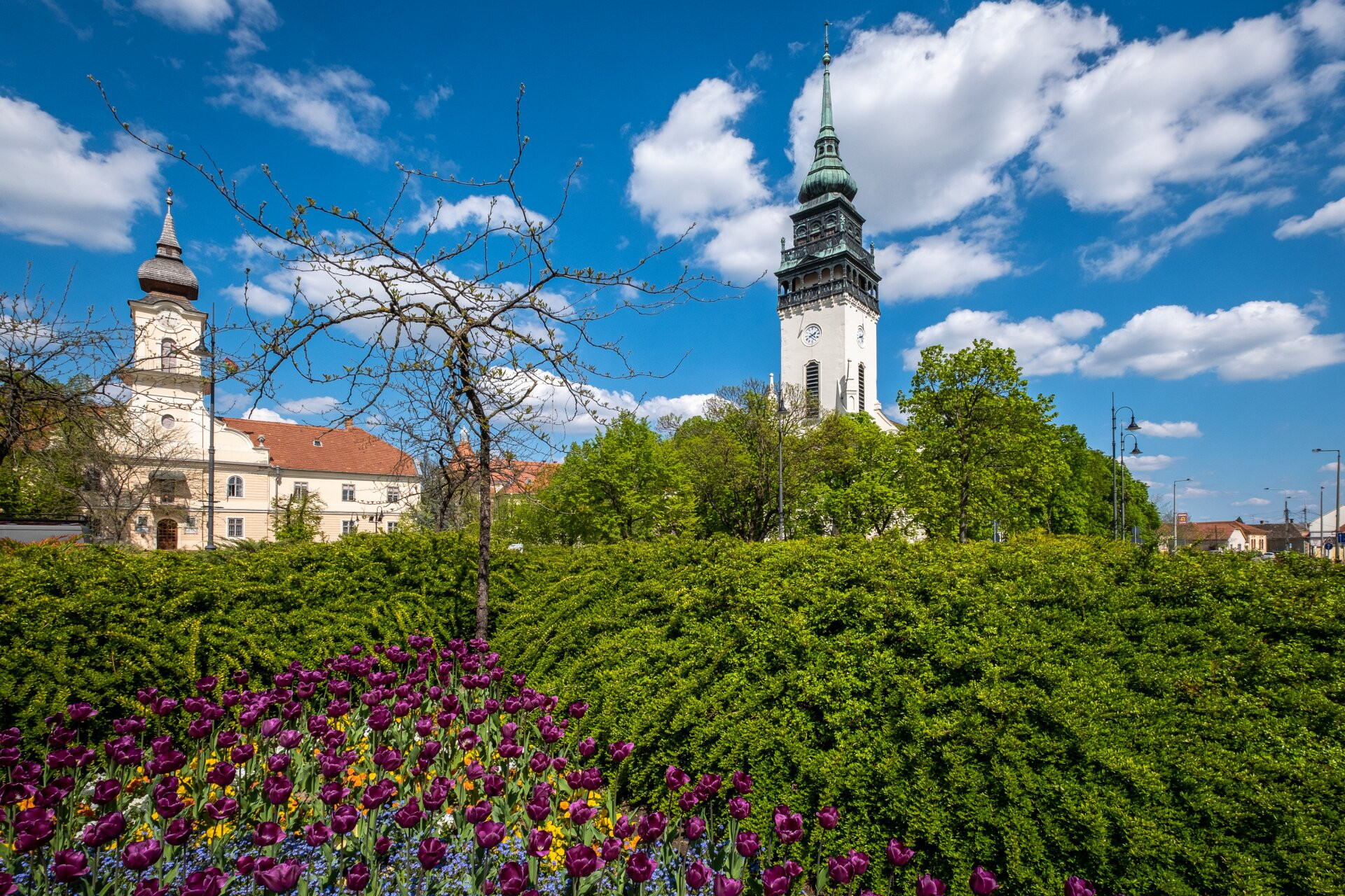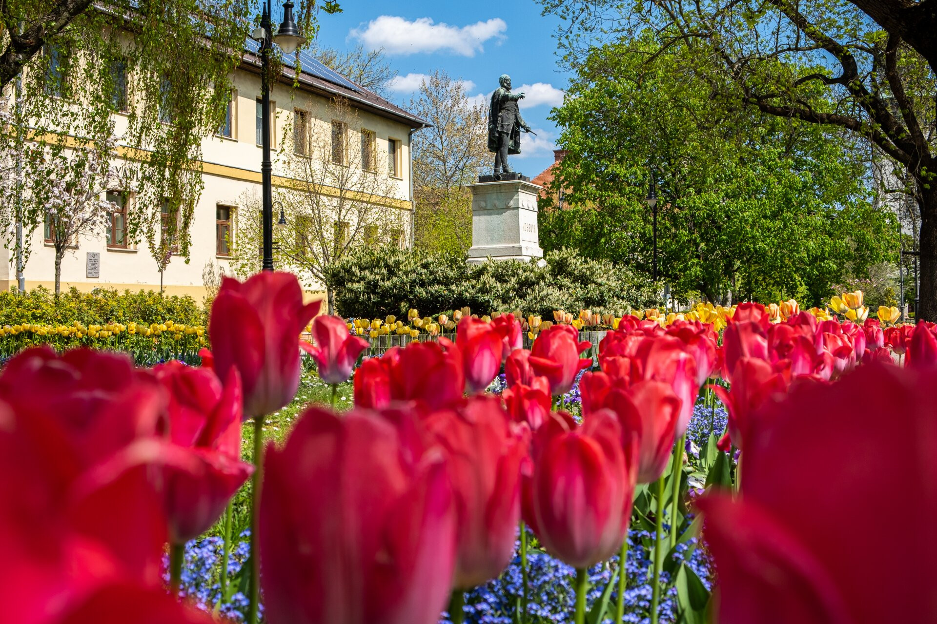 Nagykőrös Virágos Magyarország-díjat nyert főtere ebben az időszakban különösen szép, a sok zöldfelület közt ilyenkor tulipántengerben úszik.