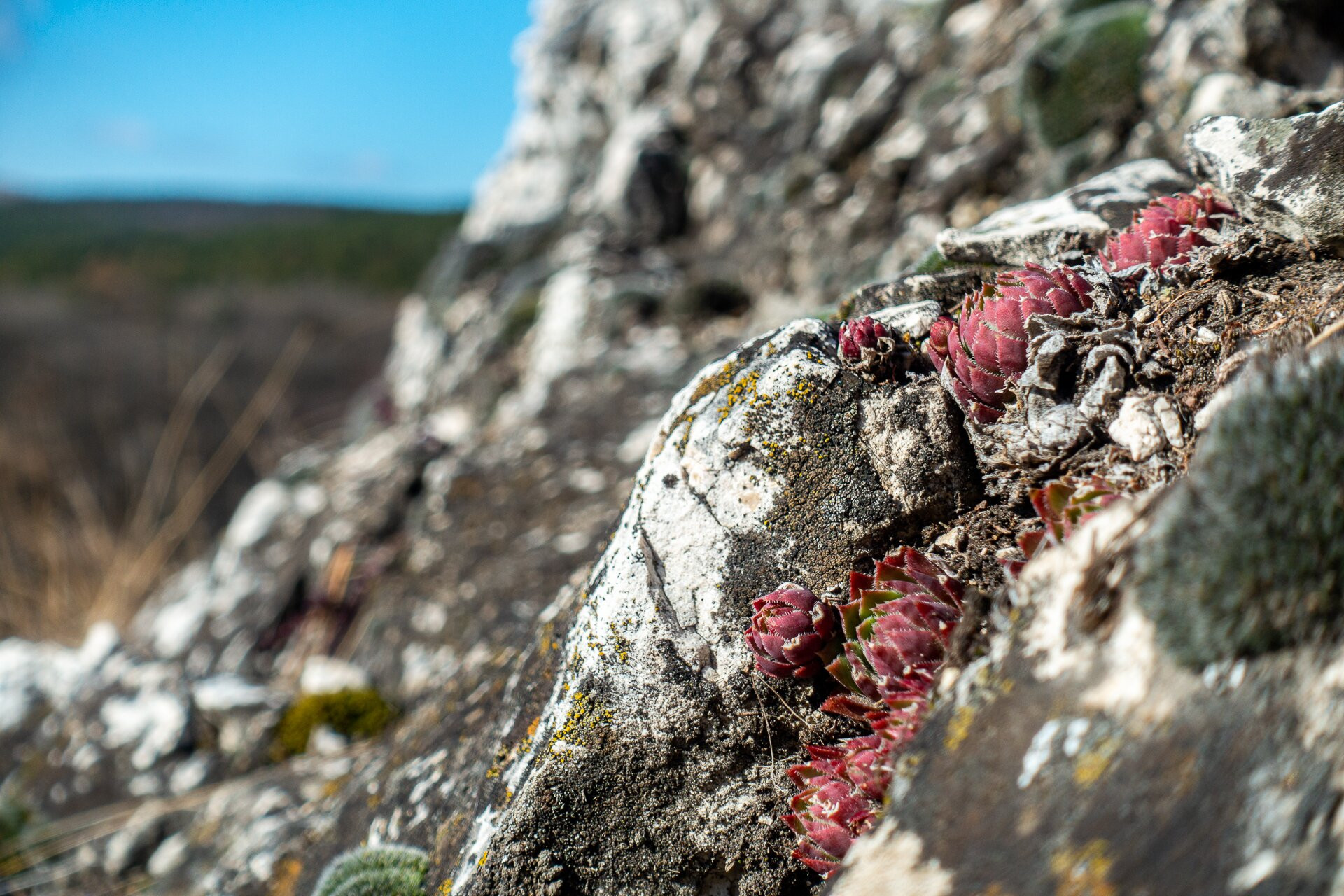 A fehér sziklákat kövirózsák sokasága díszíti
