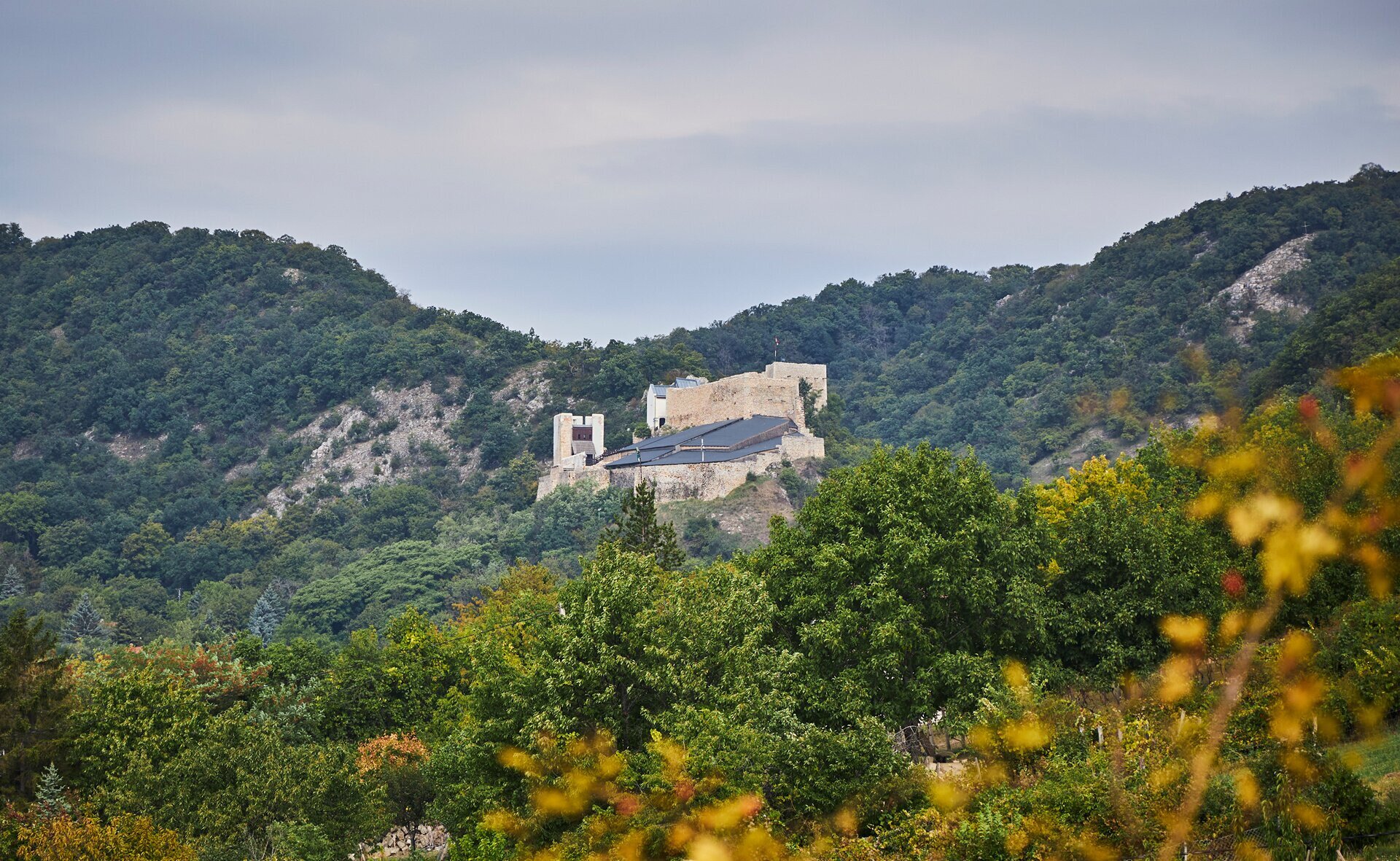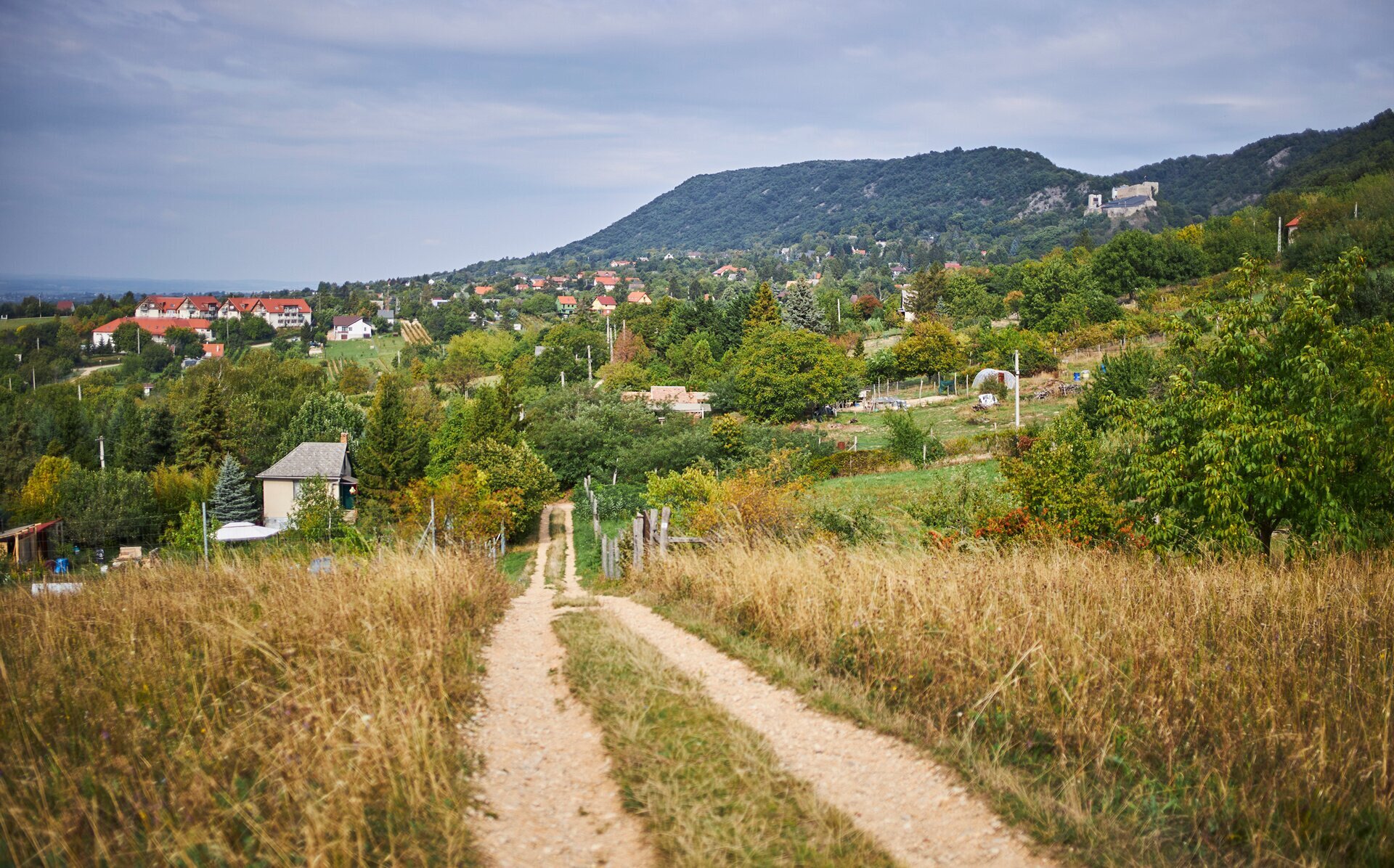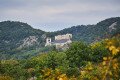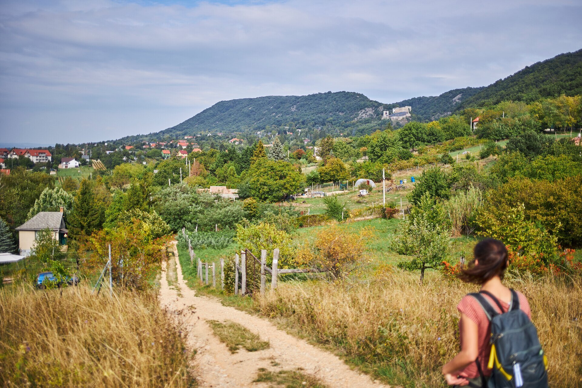 Csókakő határában rálátunk a falura és a jellegzetes formájú Csóka-hegyre, amelynek egyik sziklaormán ül a vár