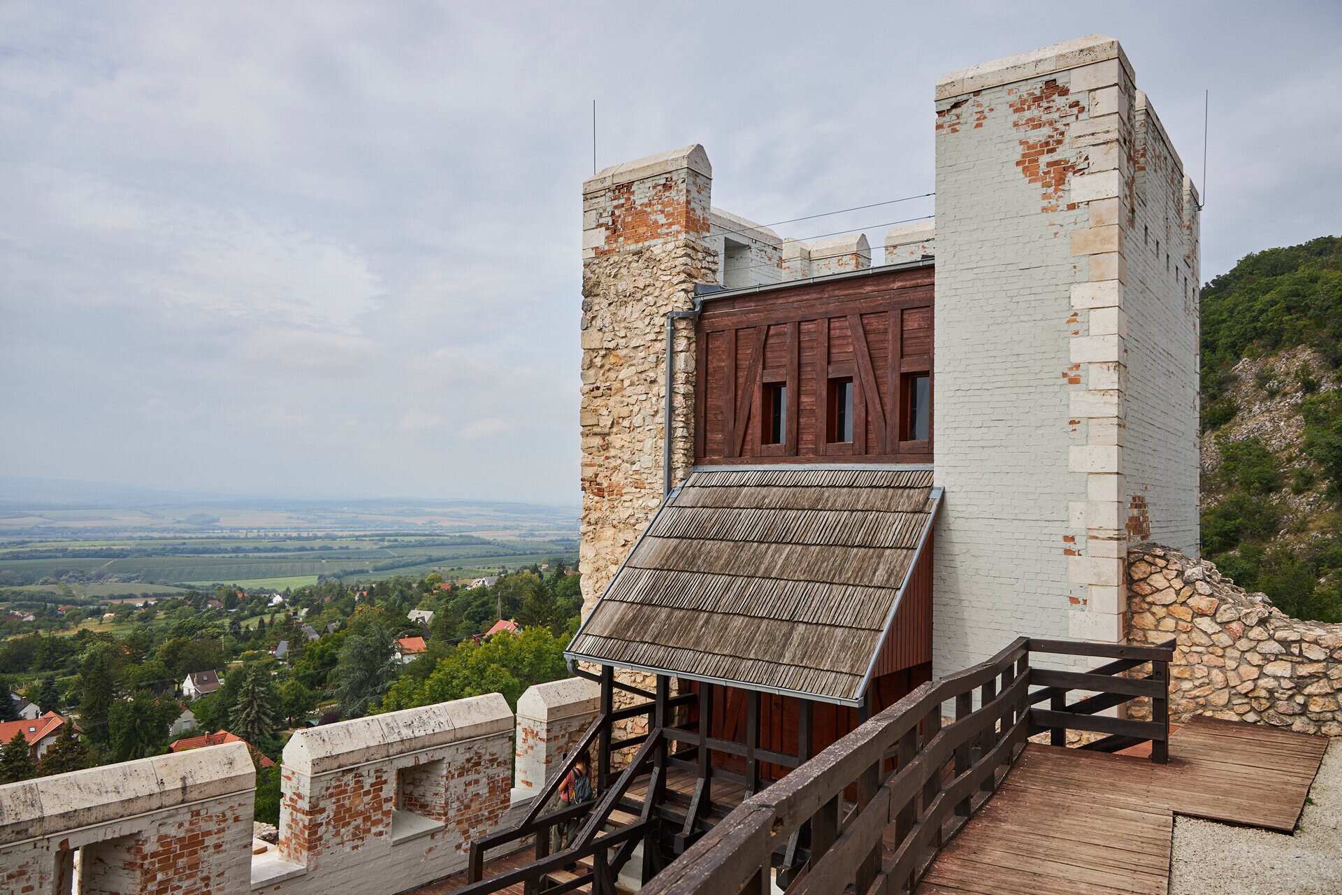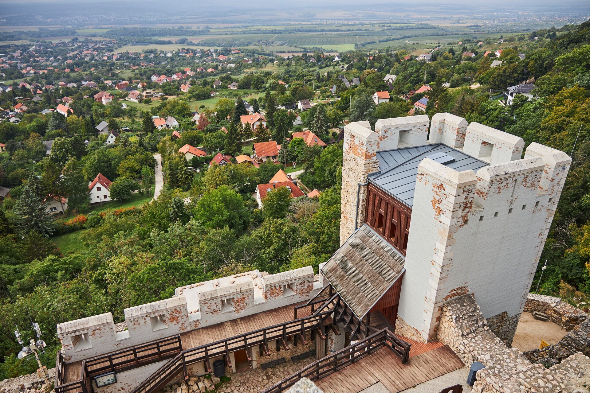 Kilátás a vár legmagasabb pontjáról a Vértes és a Móri-árok találkozásában fekvő Csókakőre