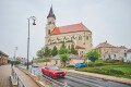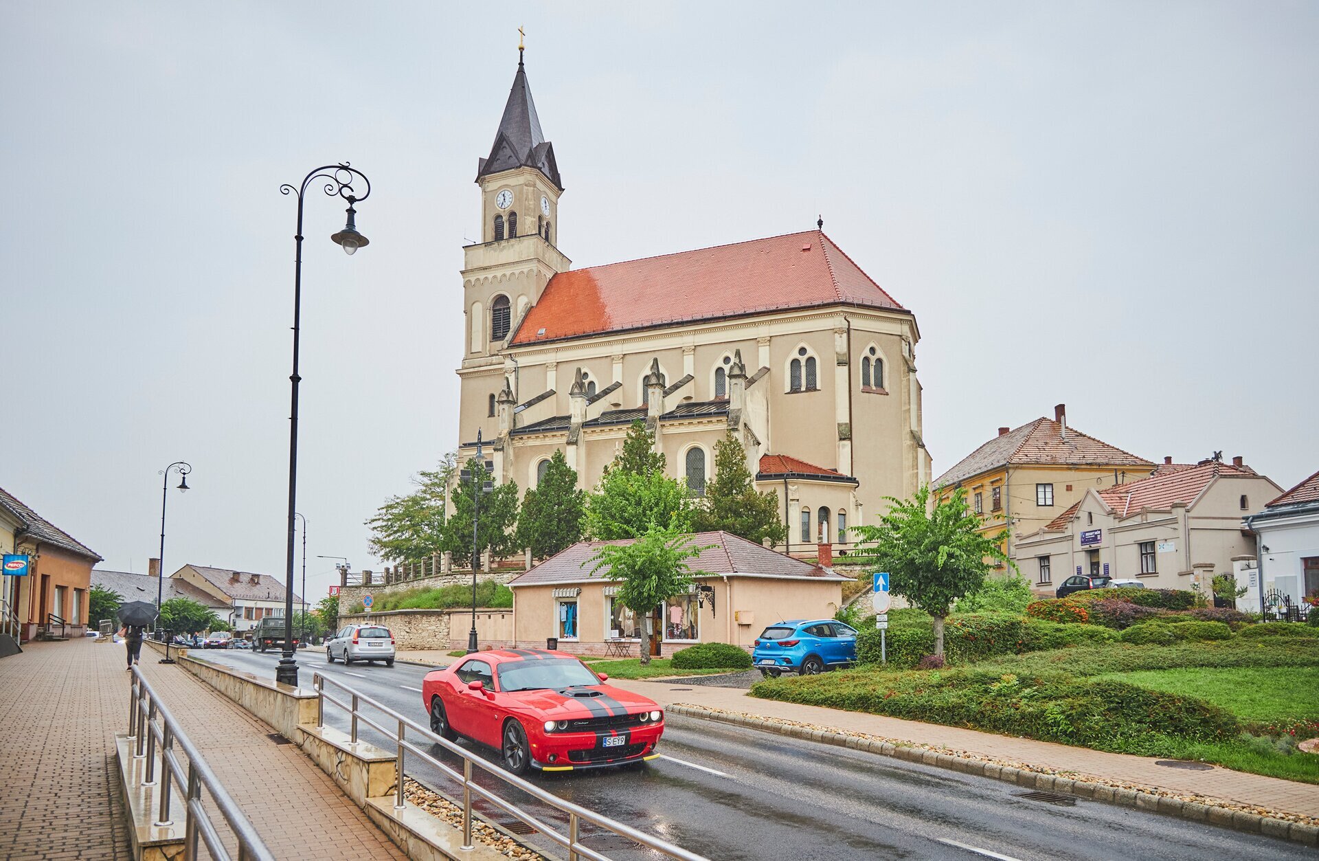 Őszi tájkép esőben ázó neogótikus templommal és piros sportautóval