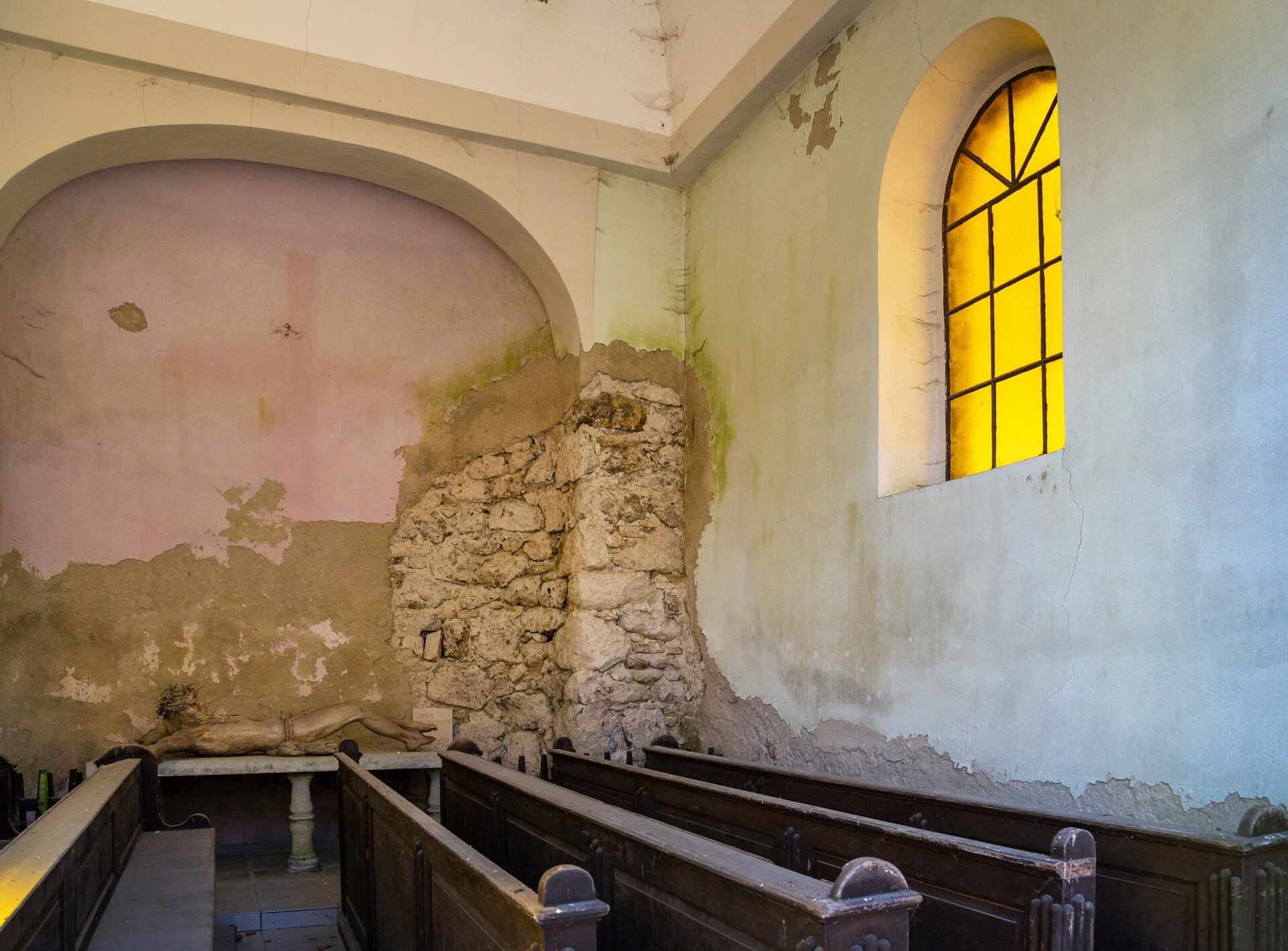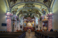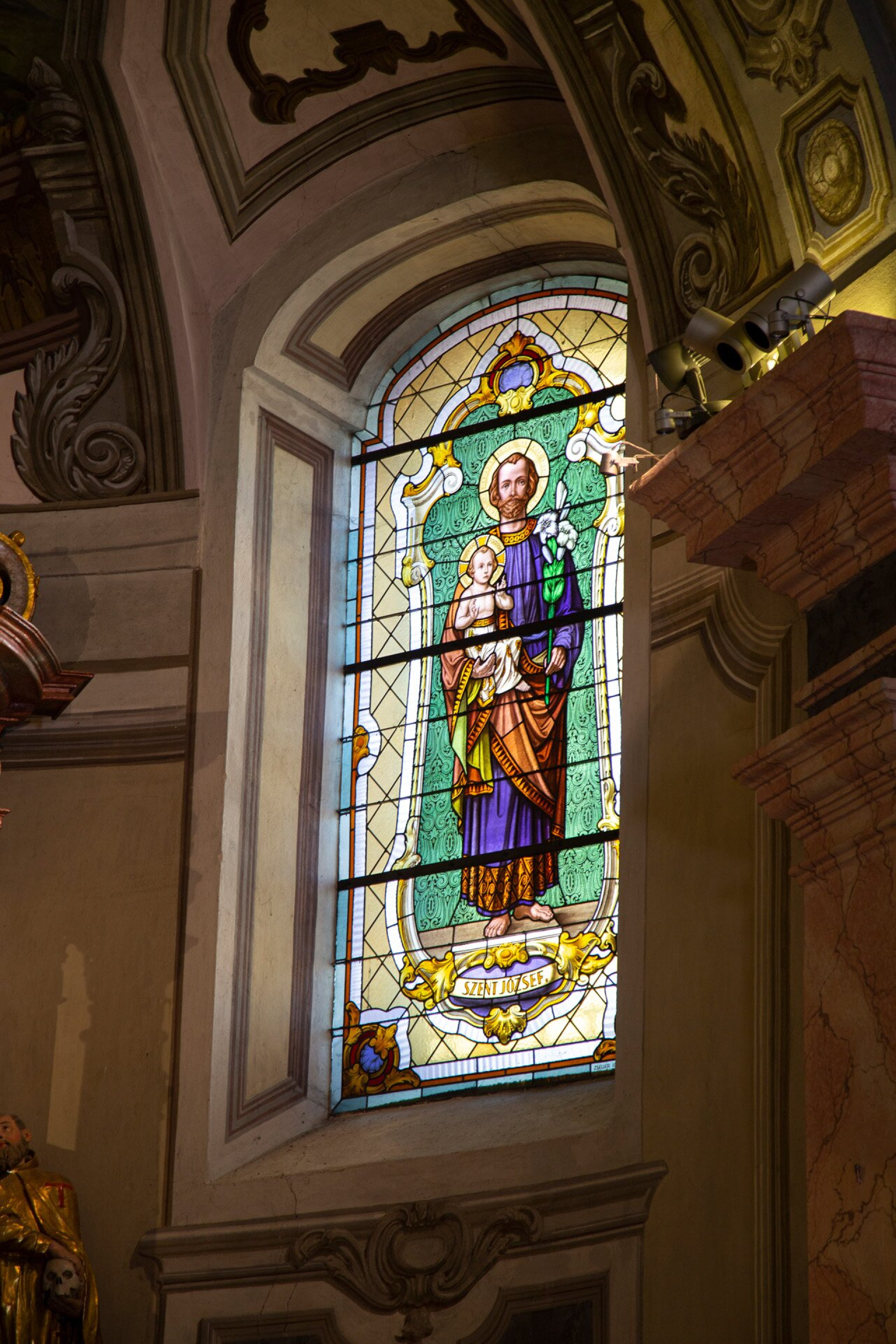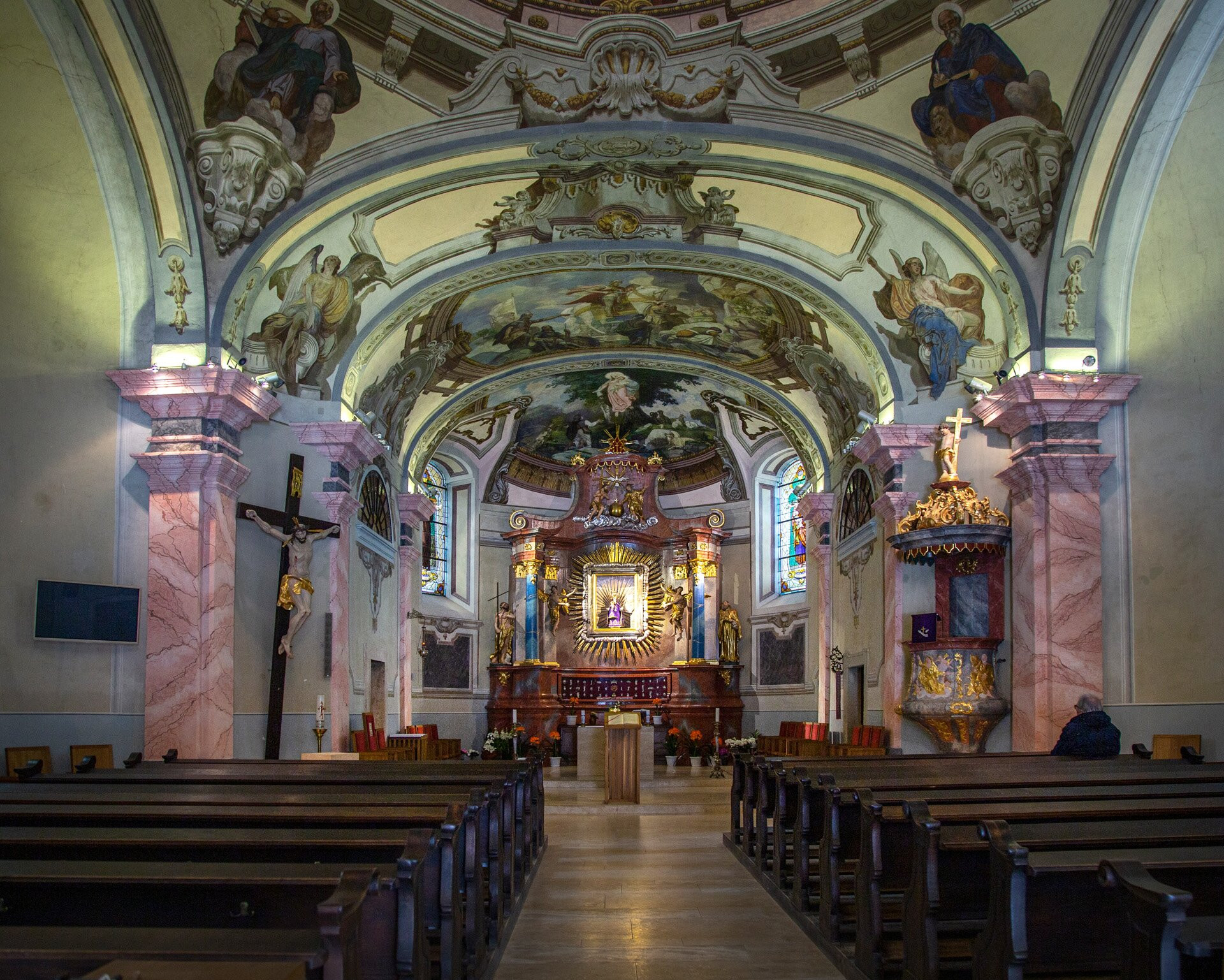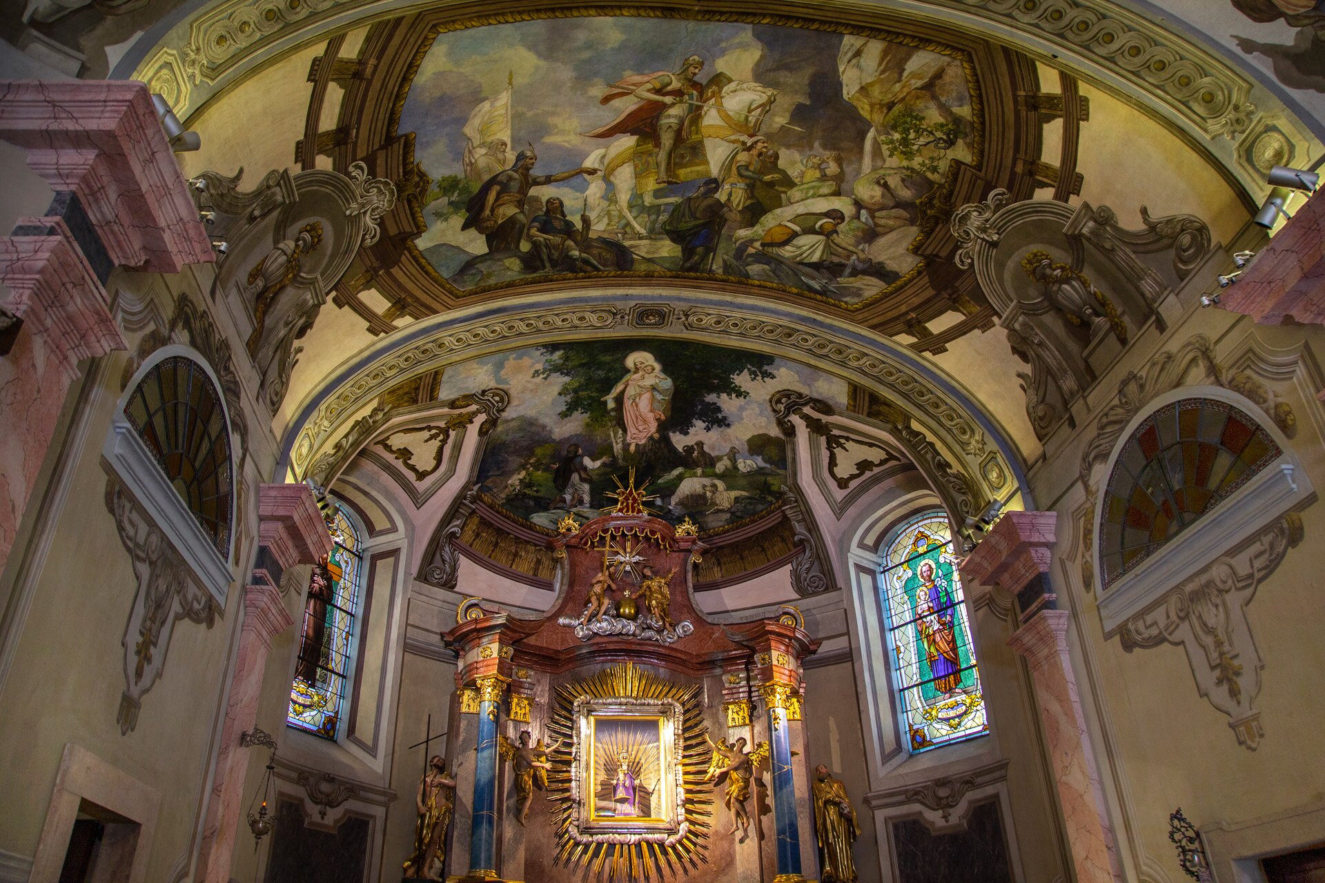 A templom mennyezeti boltozatának freskóin láthatjuk Szűz Mária mennybevételét, azt, ahogy Szent László vizet fakaszt és Szűz Mária meggyógyítja a néma pásztorfiút