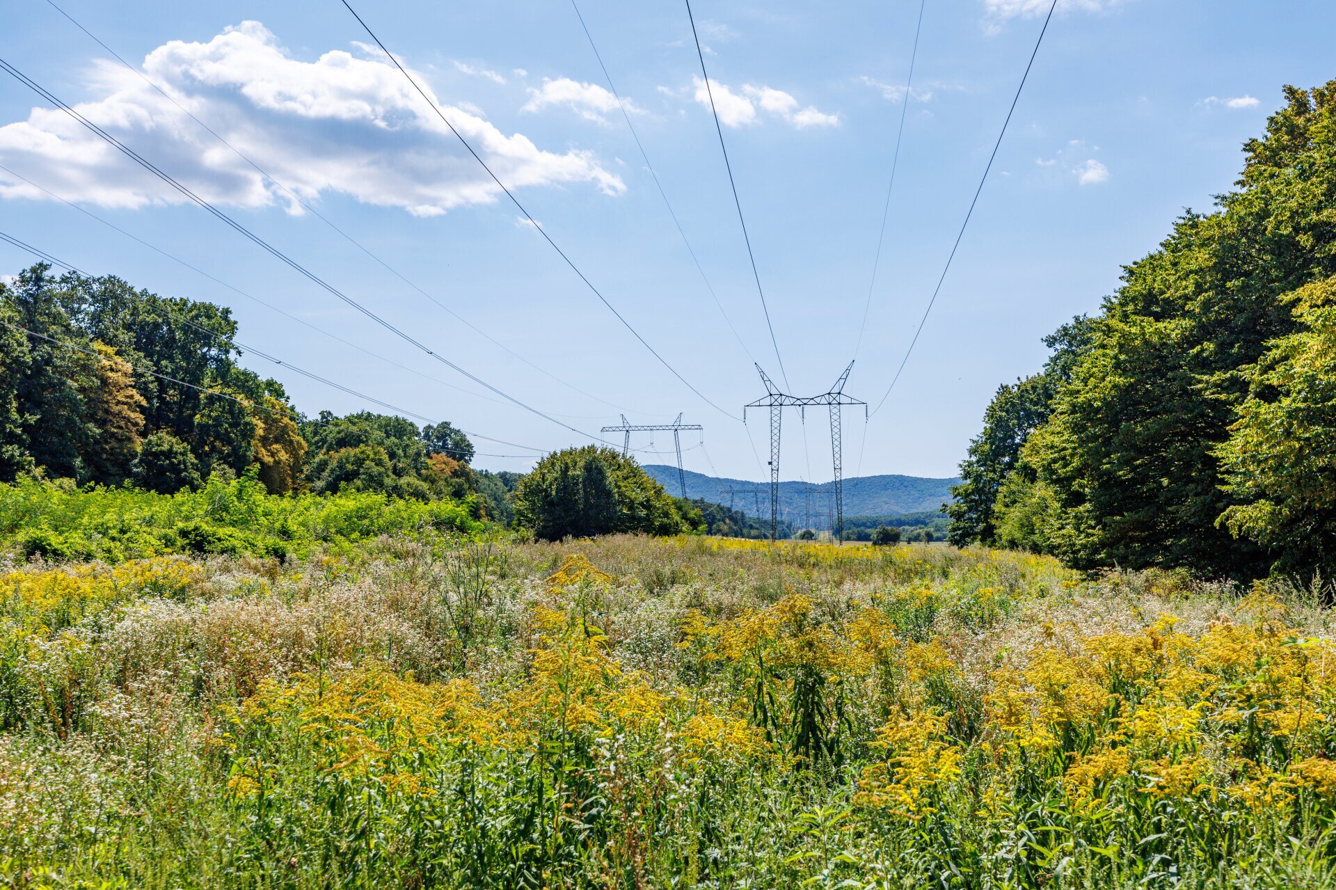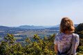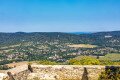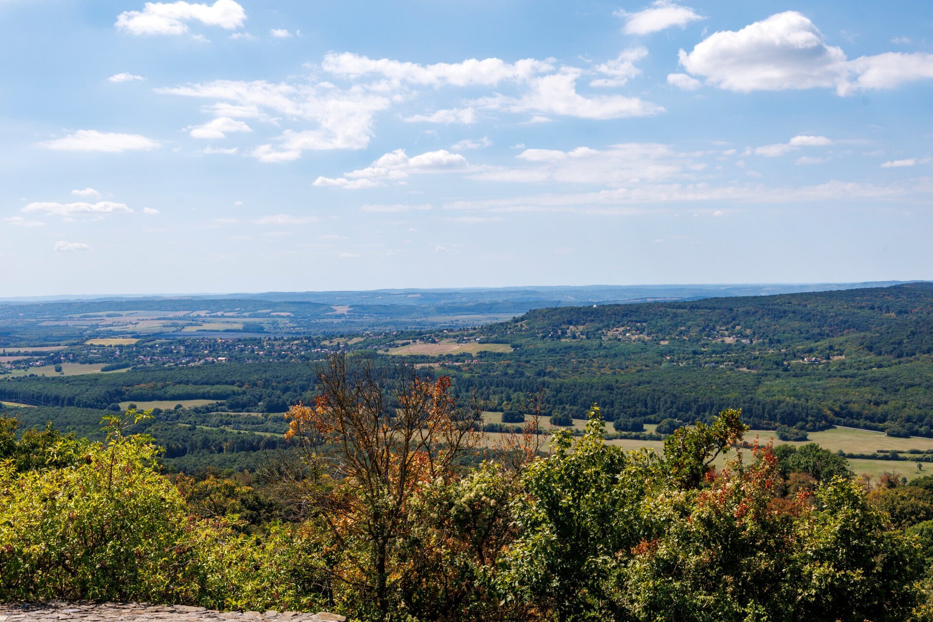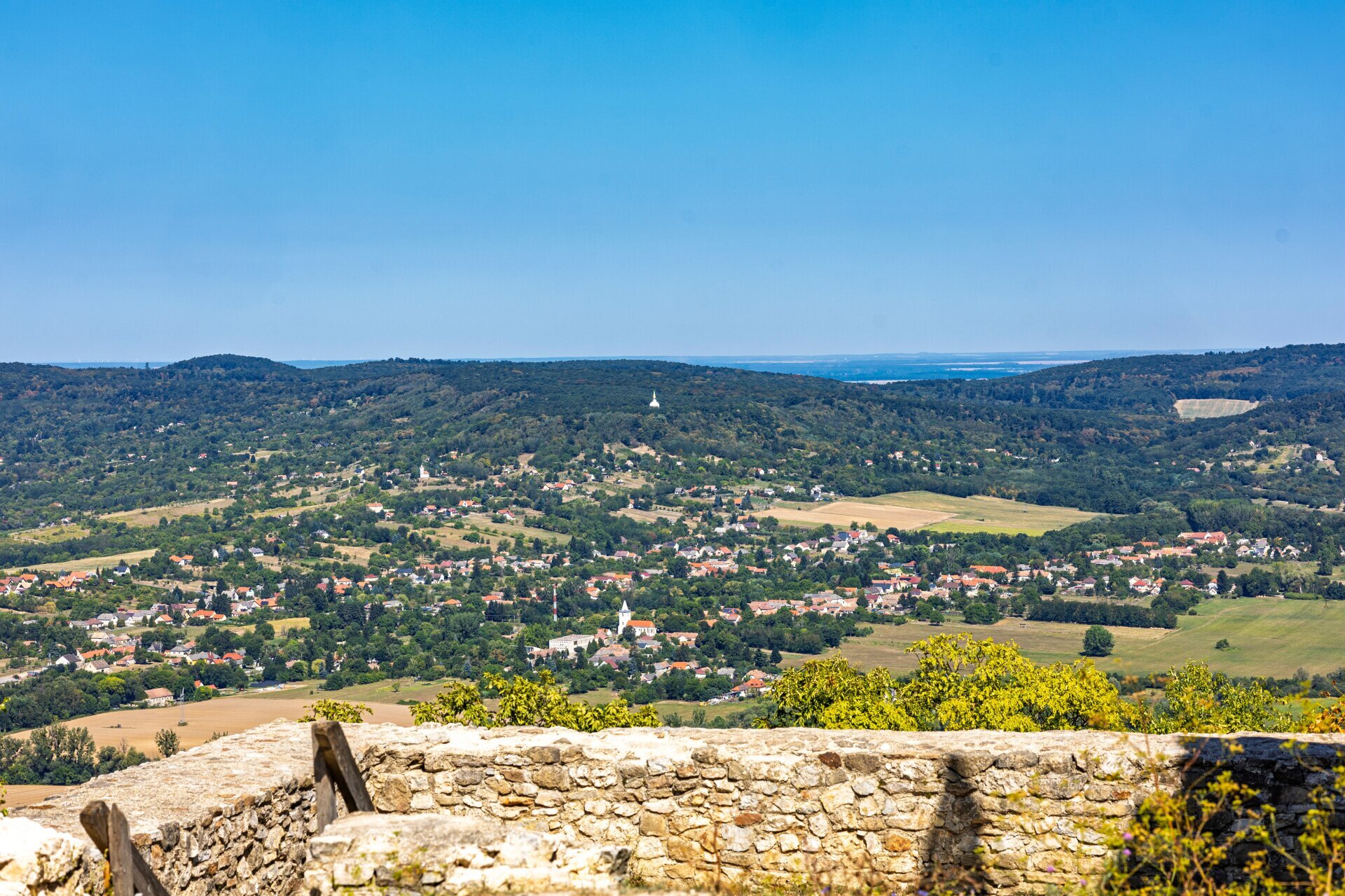 Kilátás a rezi várból. A hófehér épület, ami kikandikál a fák harsány zöldjéből, a zalaszántói sztúpa
