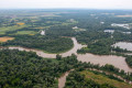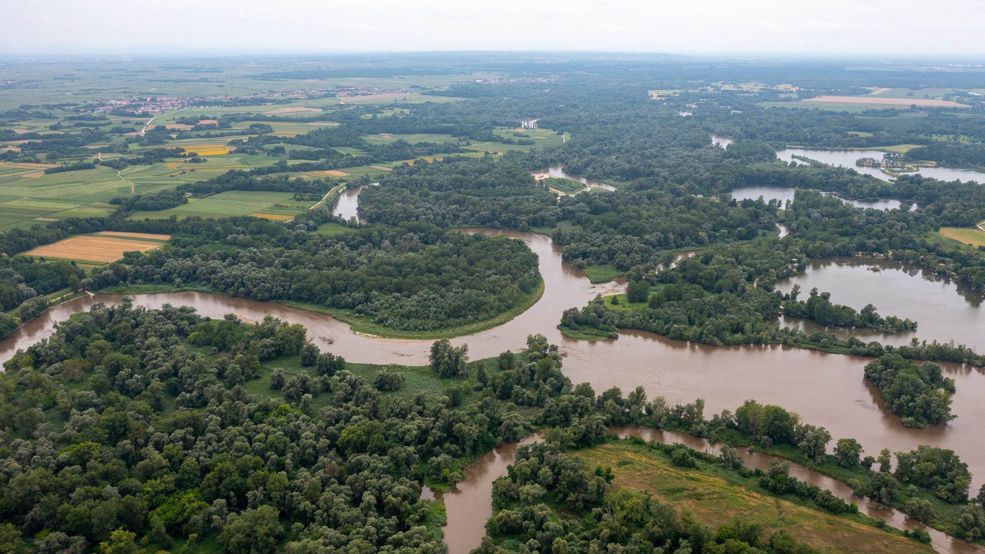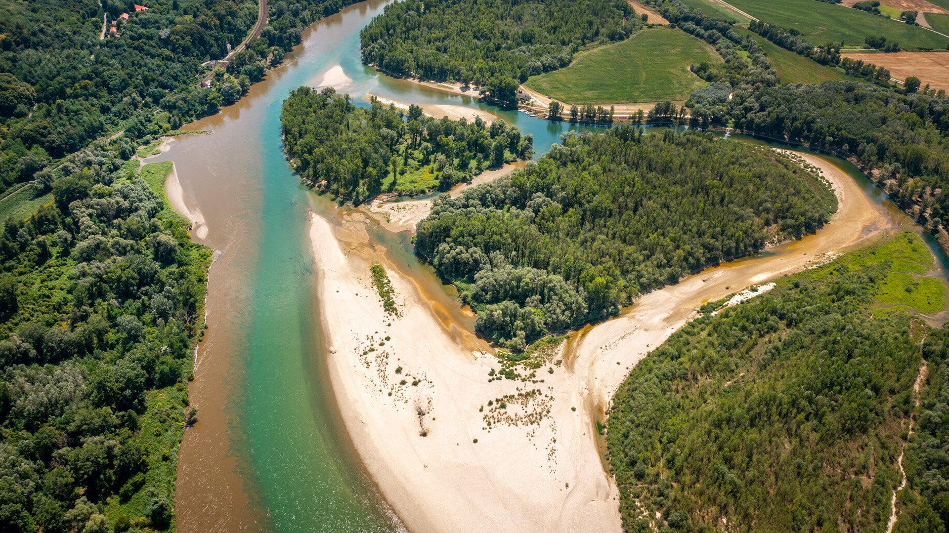 Madártávlatból a Dráva és a Mura találkozása. A smaragdzöld a Dráva, a barna a Mura. A nagy kanyarban a Dráva korábbi főága futott, ez mára részben holtmederré vált.