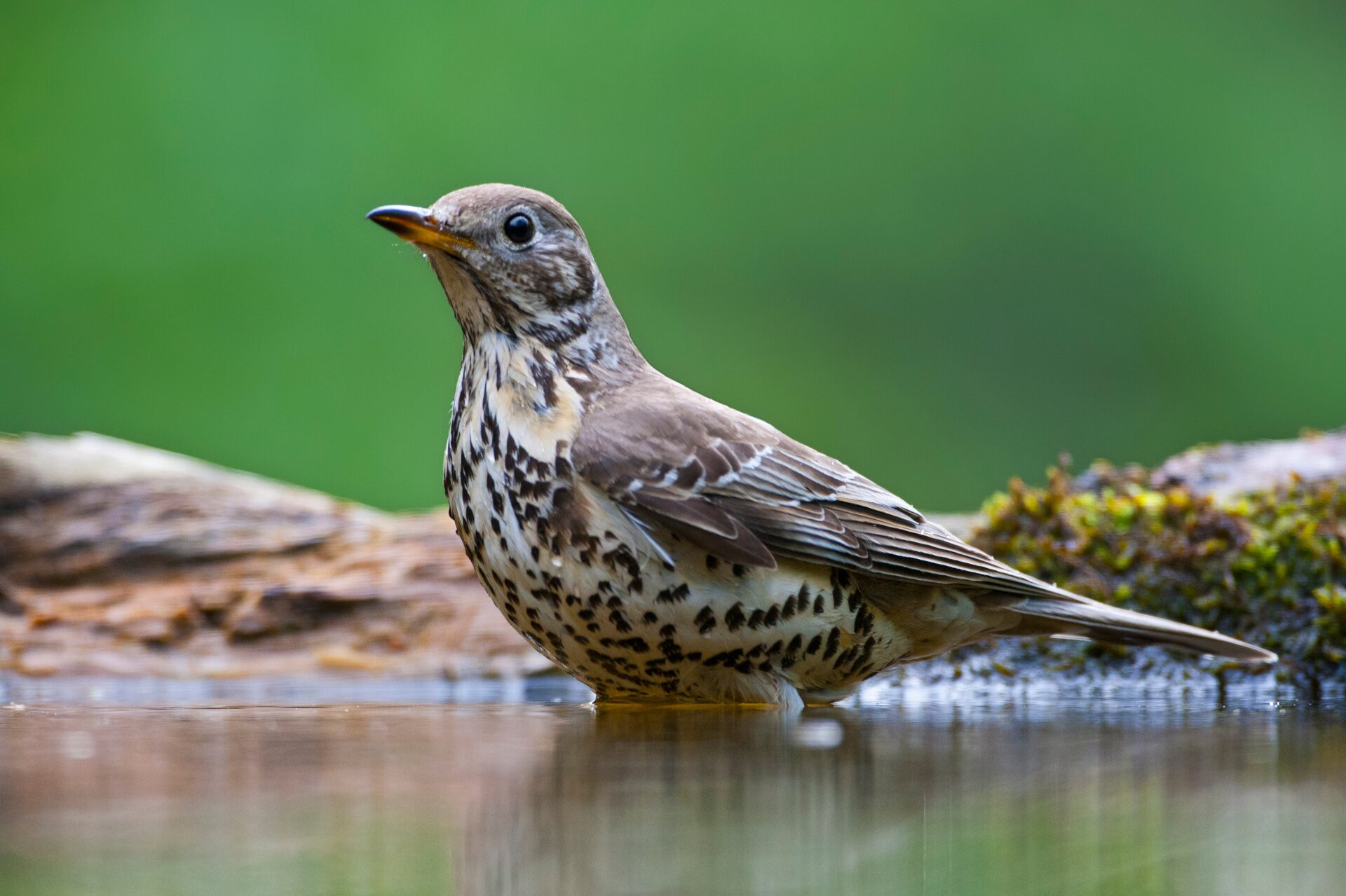 Volwassen Grote Lijster staand in het water; Adult Mistle Thrush standing in a forest pool