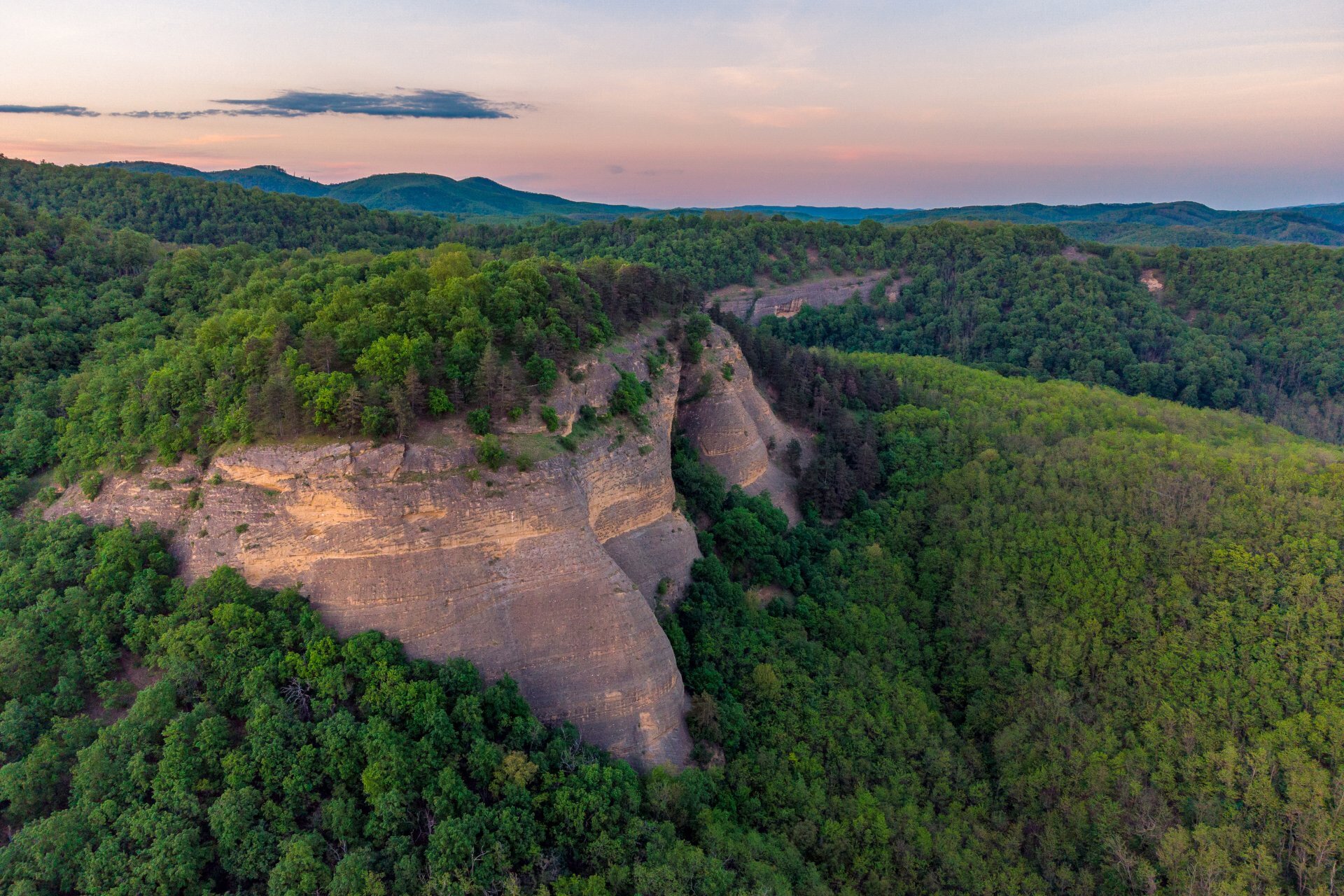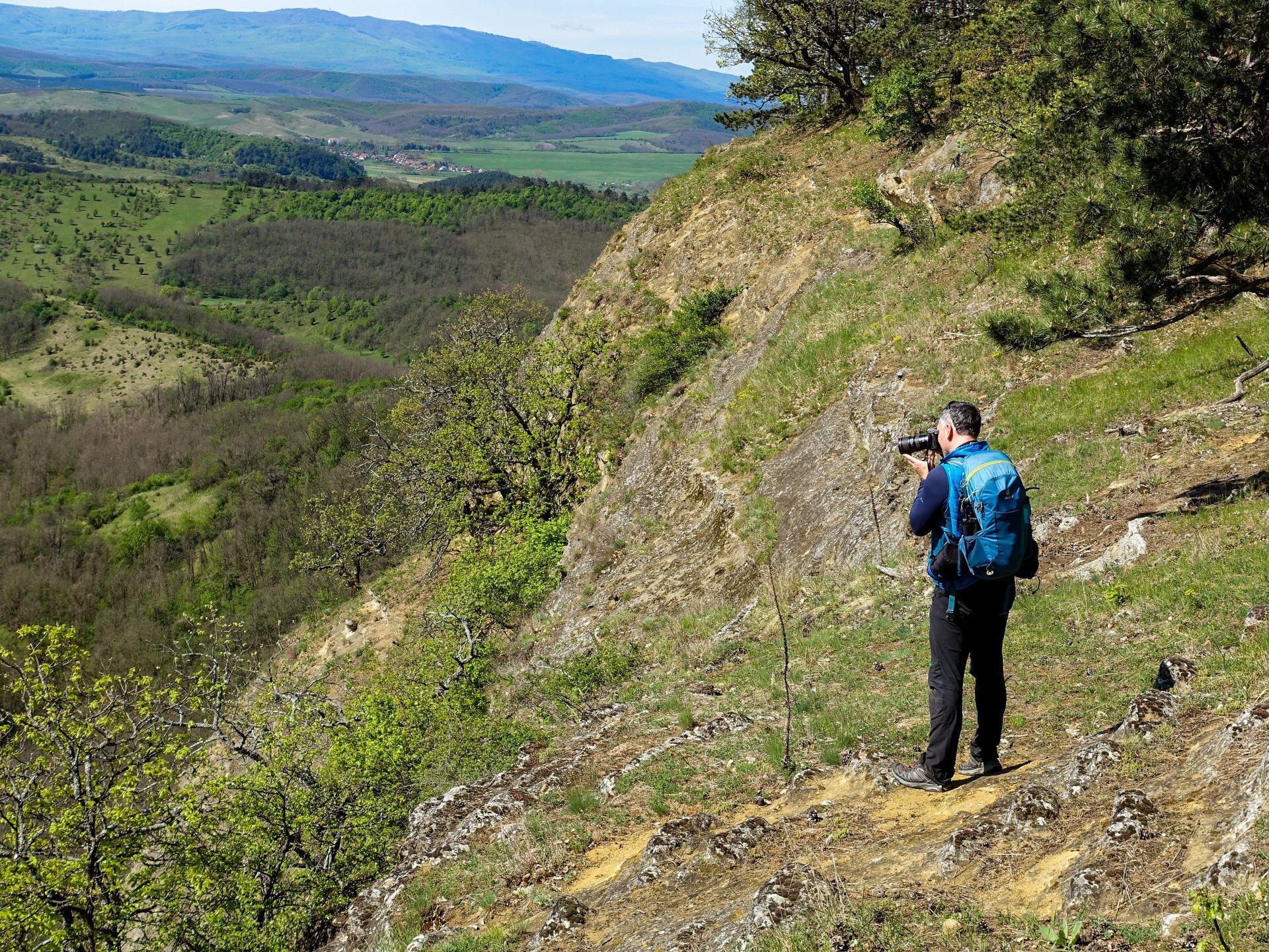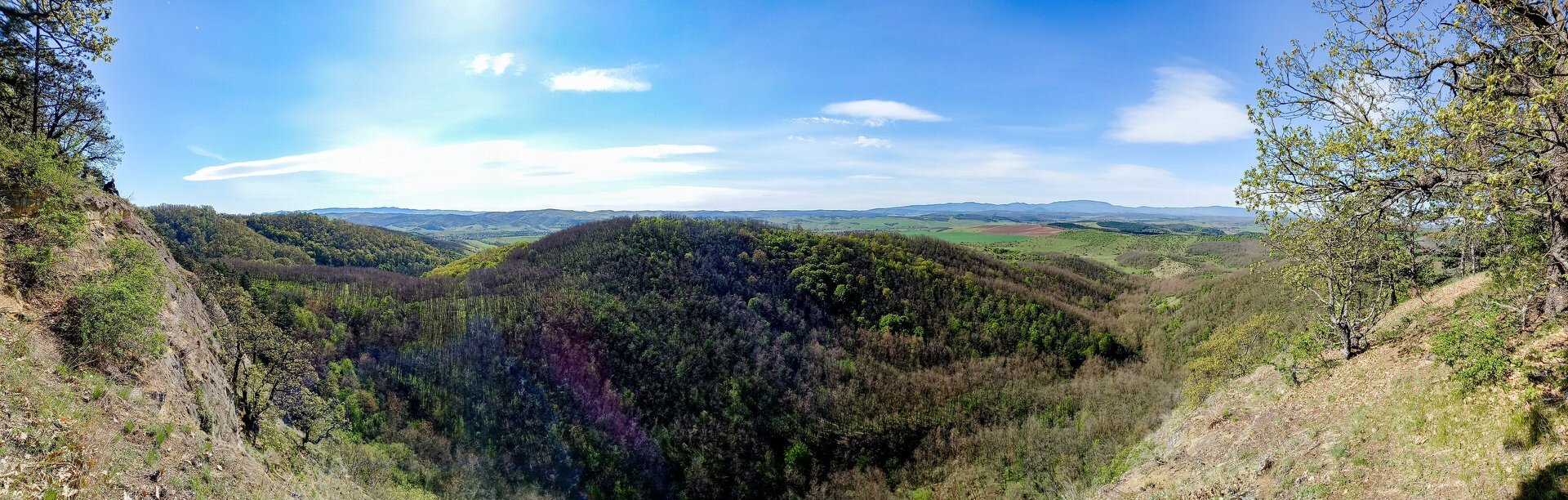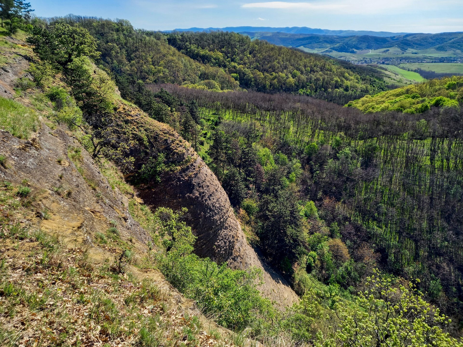 A búbos kemencének tűnő falrészlet a szikla tetejéről, háttérben a Bükk csúcsai