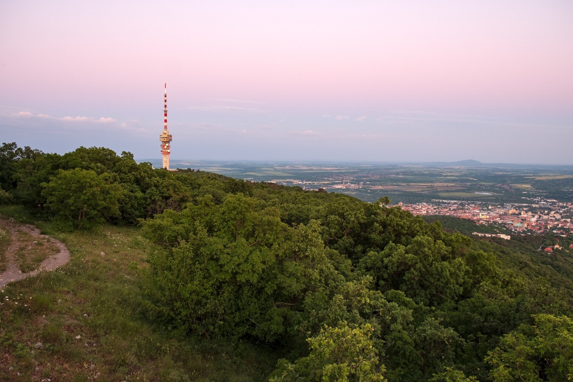 Alkonyat a Kis-Tubesről a Misina-tető tévétornyával és Pécs belvárosával