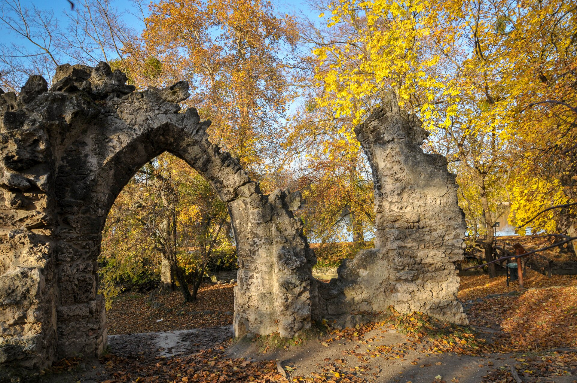 Az angolkertek romantikus hangulatának egyik jellemző eleme, a műrom, amely a mulandóság és az idő végtelenségének szimbóluma. Tatán Charles Moreau francia építész épített 1803-ban egy gótikus templom romjait megidéző műromot. Ehhez többek között a 12. század elején épült, előbb a bencések, majd a domonkos-rendiek által használt vértesszentkereszti apátság maradványait használta fel.