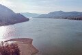 A szigetspiccet körbefolyó két Duna-ág a magasból, a háttérben a Vác melletti Naszály hegy és óriási tájsebe, melyet a több évtizedes mészkőbányászat okozott.