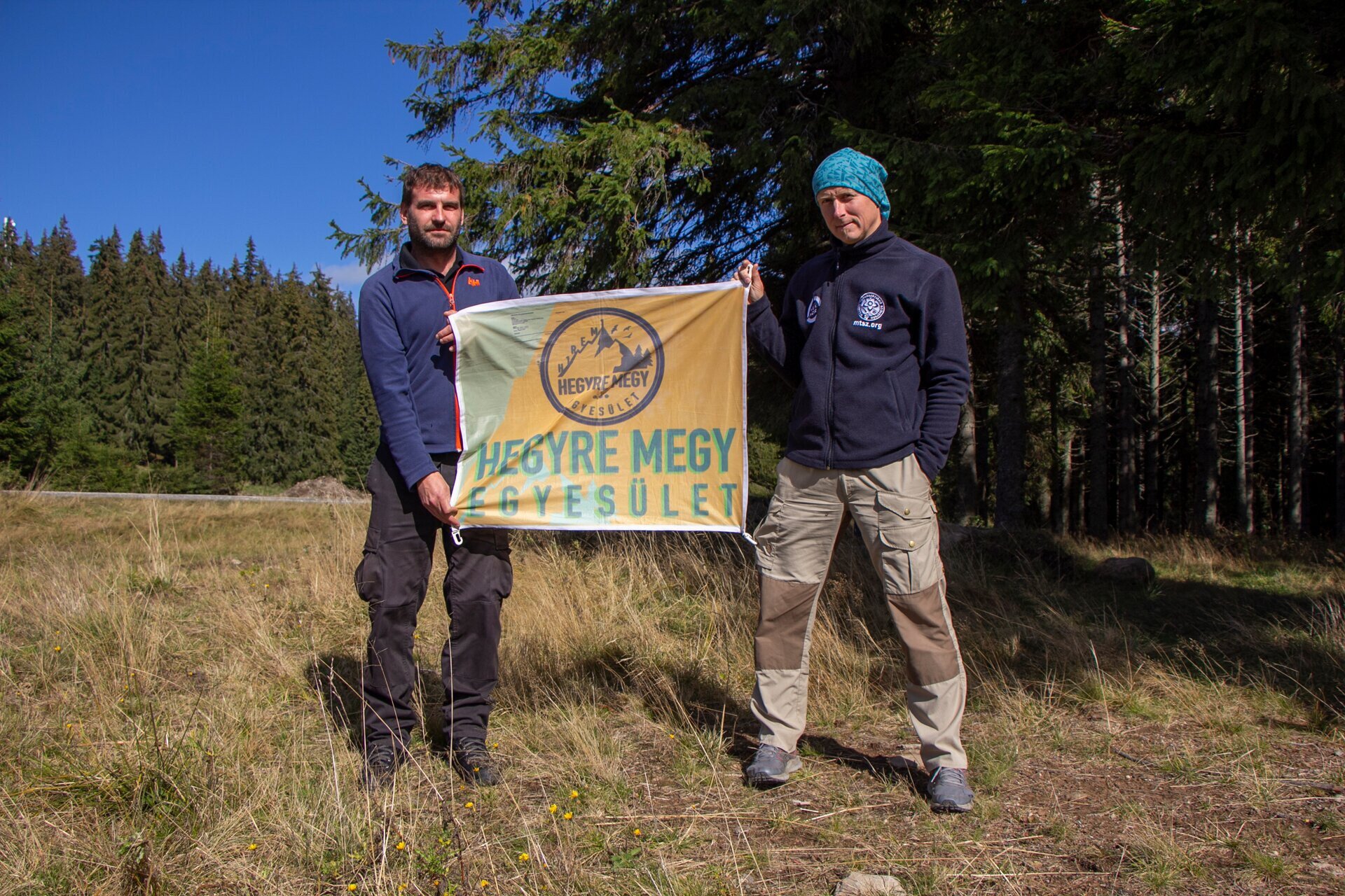Kisida András (balra) és Német-Bucsi Attila (jobbra) az egyesület zászlójával
