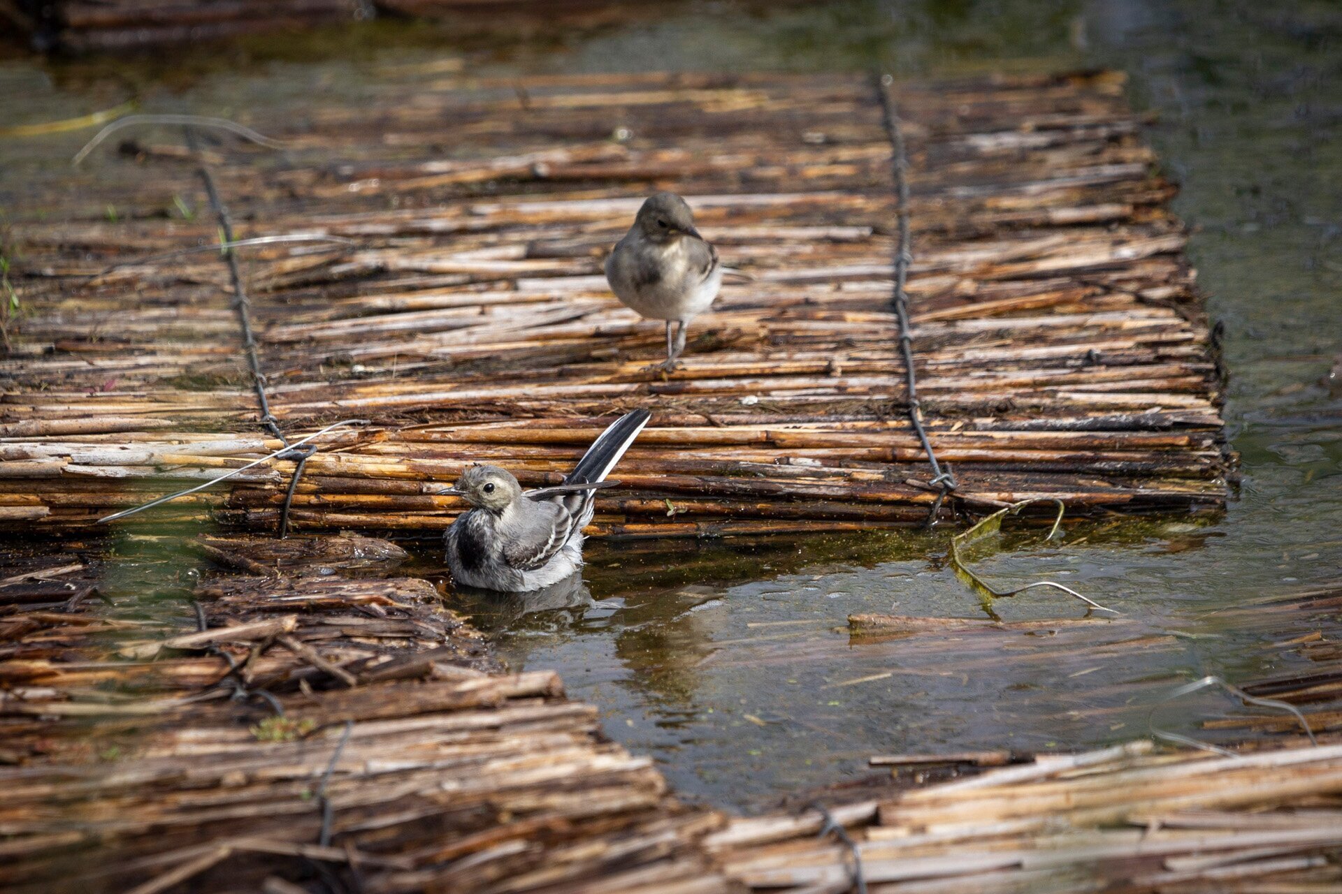 Barázdabillegetők élvezik a hűs vizet egy meleg nyári napon