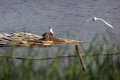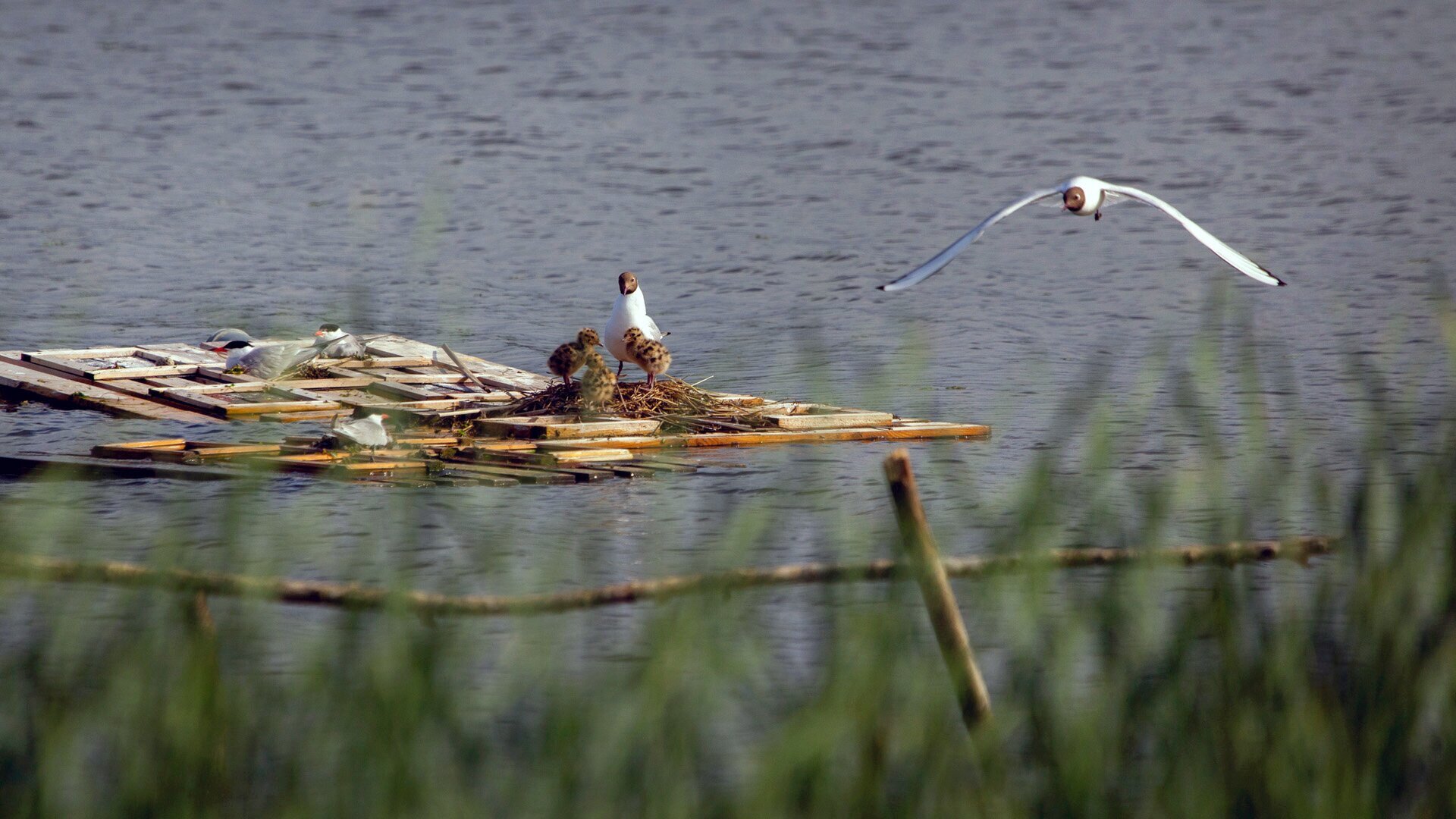 A fekete „sapkás” küszvágó csérek itt még csak a tojásokon ülnek (balra), a csokibarna fejű dankasirályok viszont már fiókáikat nevelgetik (jobbra)