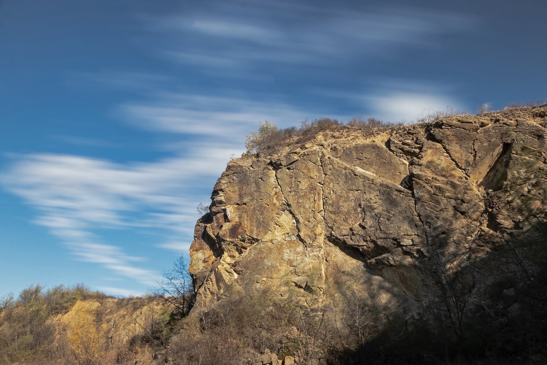 A bánya meredek sziklafalai hajnalban gyönyörű színekben pompáznak