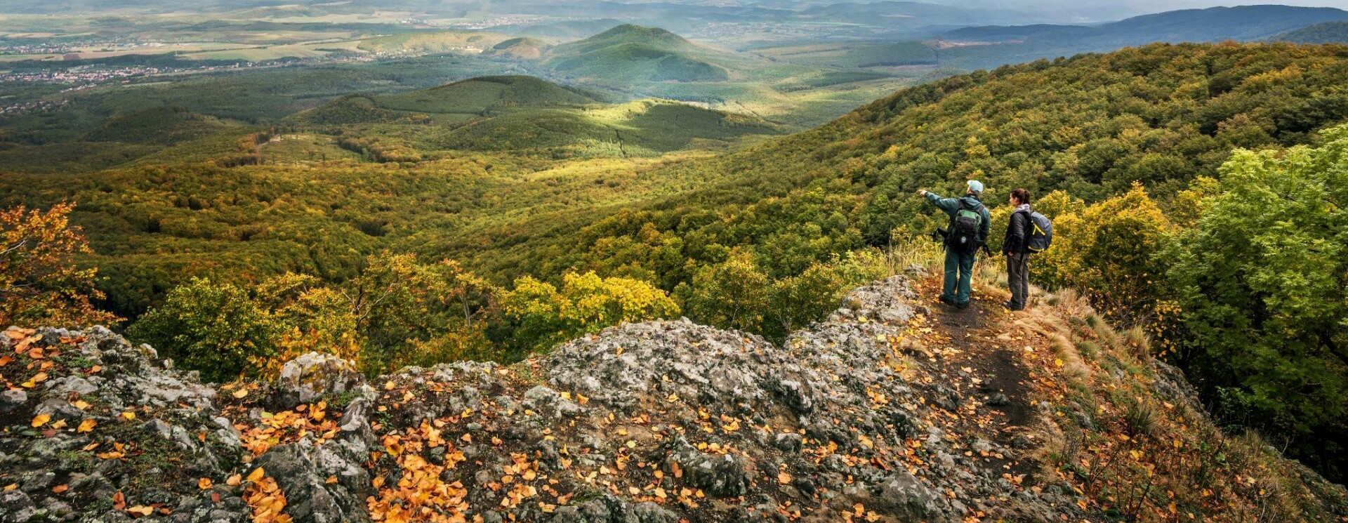Az ösvény meredek, lemosódott szakaszán pár métert ereszkedve még egy panorámapont bontakozik ki a sziklabérc oldalában. A gerinc keskeny mivoltának köszönhetően erről dél felé, az Alföldre nézhetünk ki a hosszan kanyargó oldalgerincek és az általuk közrefogott völgy fölött.