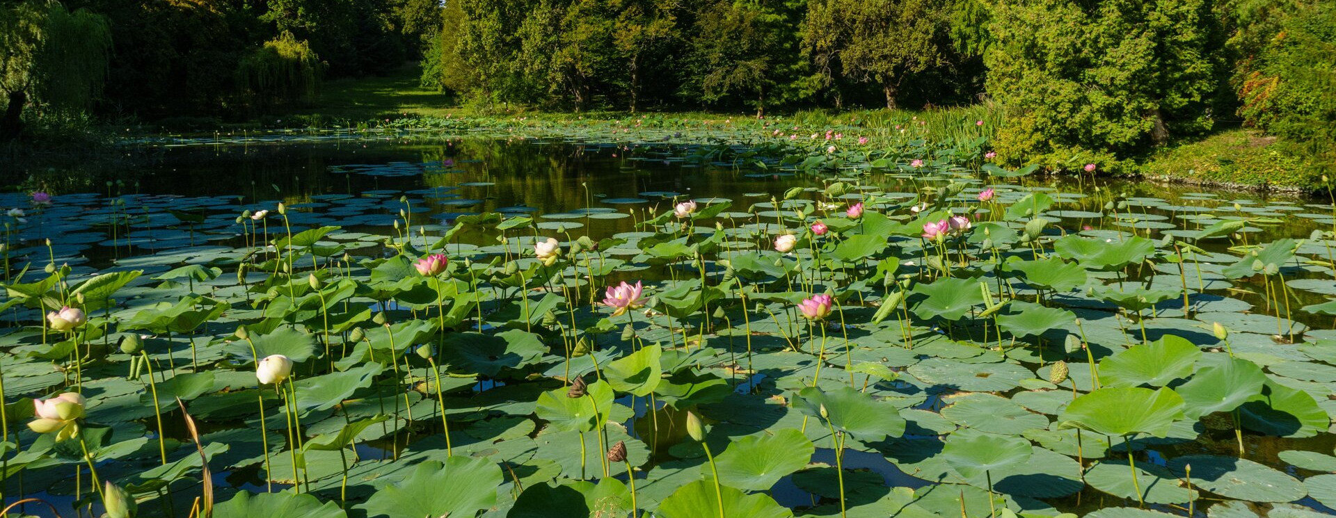 A kert központi helyén található Nagy-tó vízfelszínét szinte teljesen beborítják az indiai lótuszok