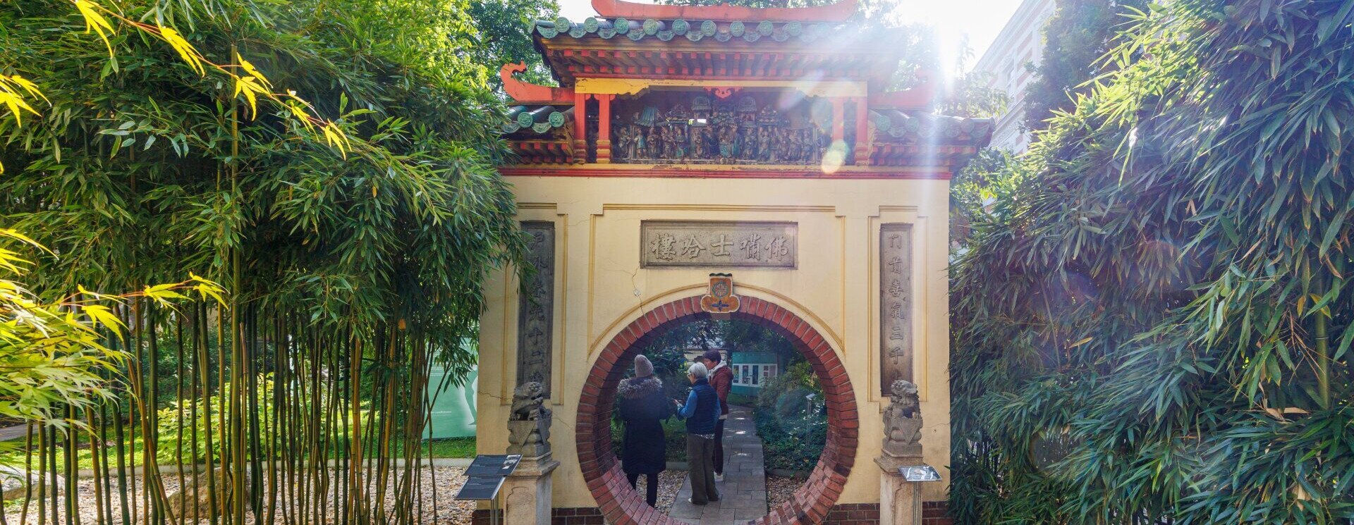 Kínai holdkapu a Hopp-villa kertjében. A kaput a teliholdat idéző nyílásának kerek formája miatt hívják holdkapunak