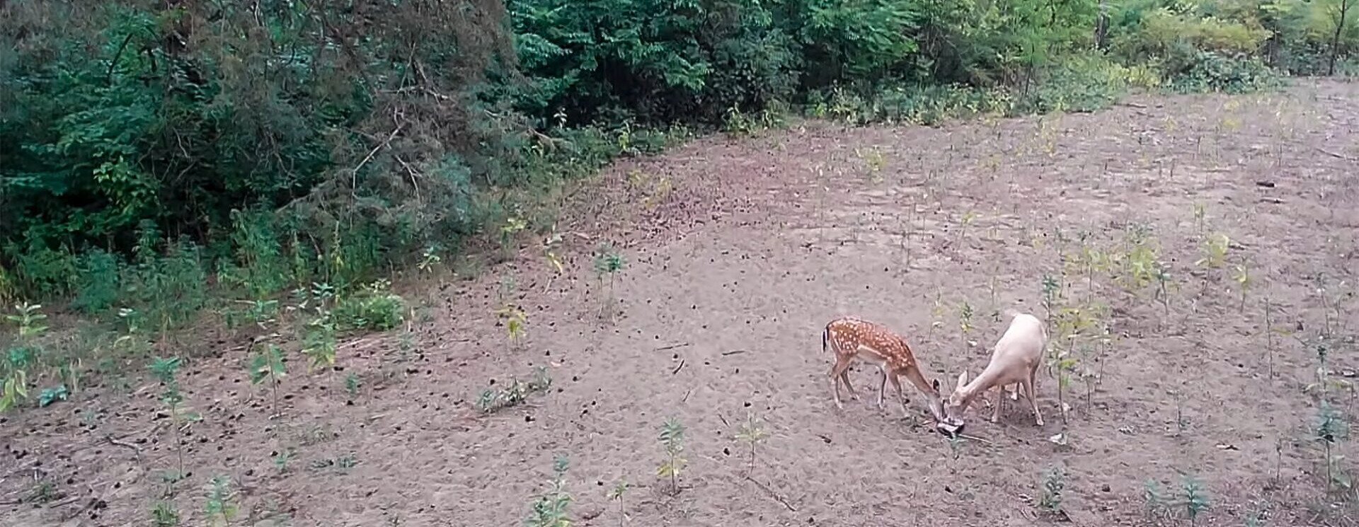 A fehér színű példány egy rendkívül ritka, leucisztikus dámszarvas, azaz nem albínó – a különbség például a szemszínben keresendő. Ez a genetikai állapot azonban szintén csökkent vagy hiányzó pigmentekkel jár a szőrzetben.