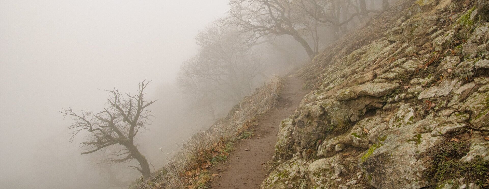A Spartacus-ösvényen ezúttal csak pár méteres volt a látótávolság, a környező hegyeket sűrű fehér lepel rejtette el, csak a ködben álló girbe-gurba molyhos tölgyek szileuttje látszott.