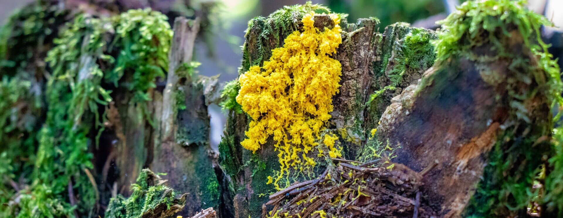 Egy novemberi, ködös túrán vettem észre először, egy mohos sziklafalon. Apró, sárga gyöngyök sokasága ült egymás mellett. Először azt hittem, valami állat rakta le ide a petéit, de lévén hideg november, ezt hamar el is vetettem. Aztán egy online határozócsoportban megtudtam, hogy nyálkagombát láttam, amiről korábban sosem hallottam még.